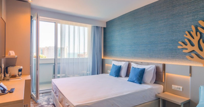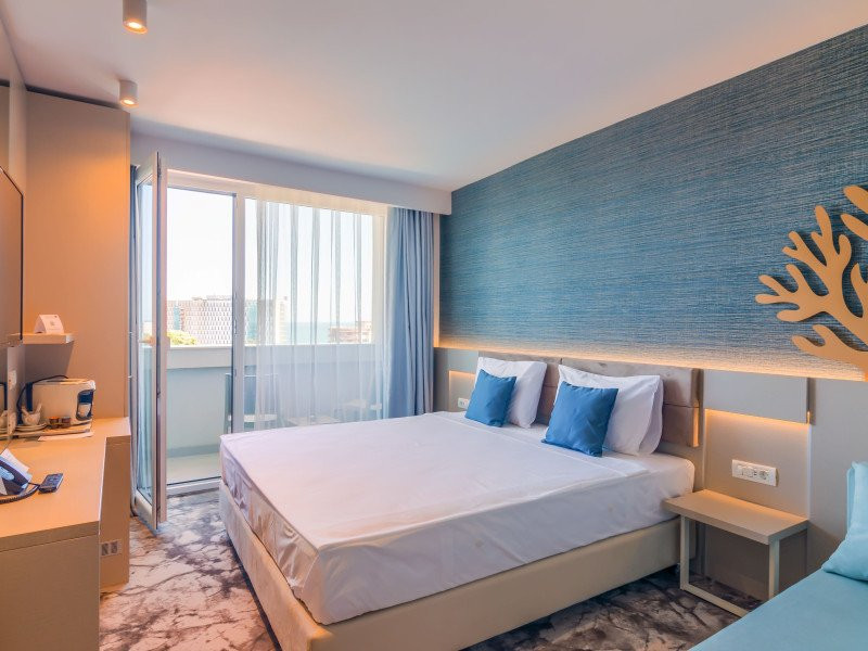 Camera Koralio: cu o suprafata de aproximativ 20 mp, dispune pat matrimonial de 180x200 cm sau doua paturi twin de 90x200 cm (repartizarea se face la receptie), mobilier nou, climatizare, seif, birou, wi-fi, TV, telefon, minibar, baie cu cabina de dus, articole de baie, uscator de par, balcon si podele mochetate. Capacitate maxima: 2 adulti si 1 copil.