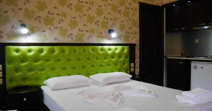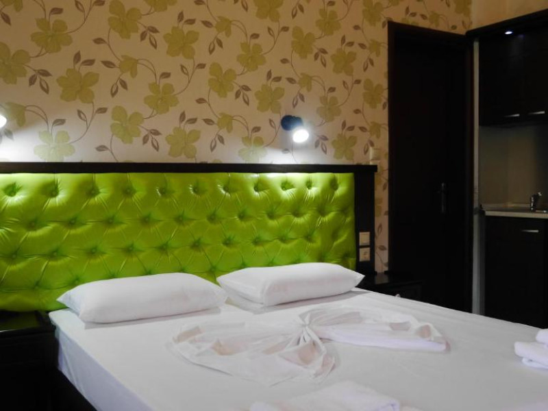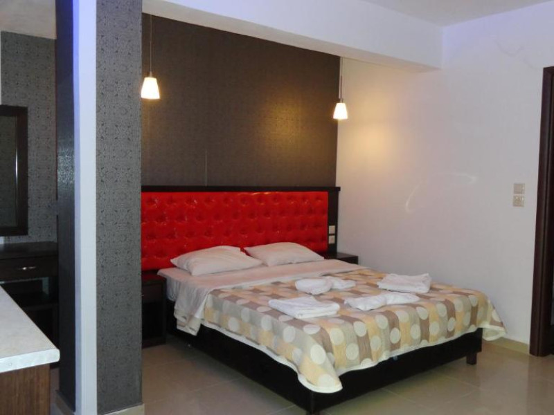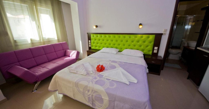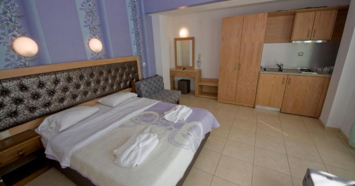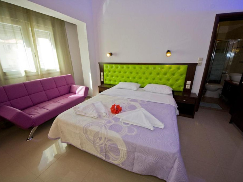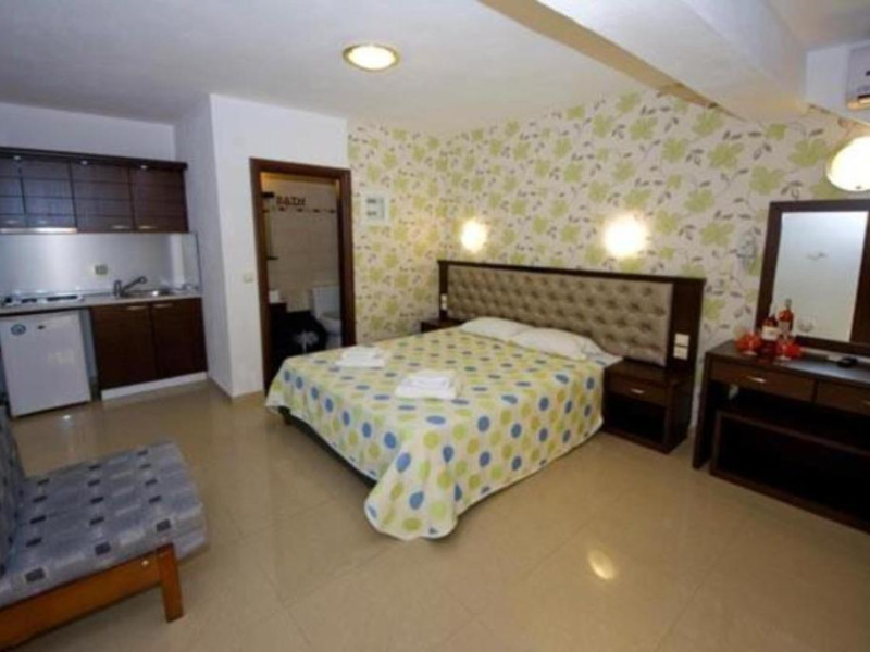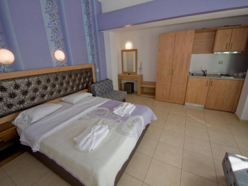 Camerele luminoase și confortabile sunt dotate cu aer condiționat, TV, mini-frigider și balcon, multe dintre ele oferind priveliști spectaculoase spre Marea Egee. Oaspeții se pot bucura de piscina in aer liber inconjurată de șezlonguri și umbrele, precum și de barul de la piscină care servește băuturi răcoritoare și cocktailuri.