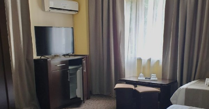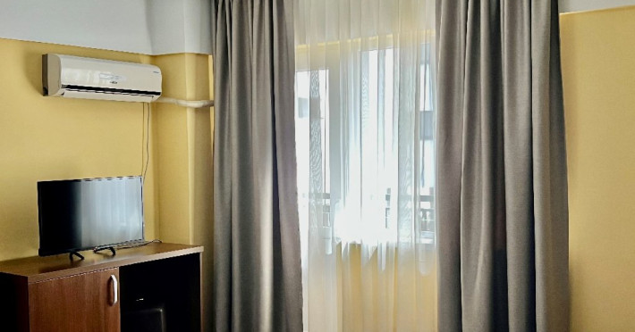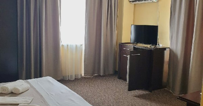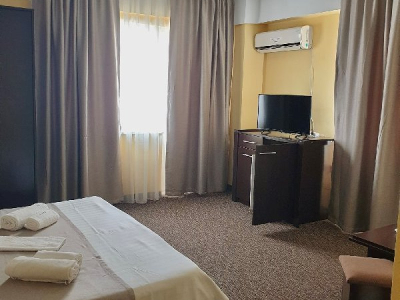DESCRIERE CAMERE Numar total camere: 25 (19 Camere Duble, 4 Camere Triple, 2 Apartamente) Camerele Duble: au suprafata de 25 mp, sunt dotate cu pat matrimonial (160x200), aer conditionat, LCD tv, minibar, wi-fi, balcon, plase de tantari, podele cu mocheta, baie cu cabina de dus si cosmetice hoteliere. Camerele Triple: sunt dotate cu pat matrimonial 160X200 si 1 pat single 90X 200, aer conditionat, LCD tv, minibar, wi-fi, balcon, plase de tantari, podele cu mocheta, baie cu cabina de dus si cosmetice hoteliere. Apartamentele: sunt situate la etajul 4, au suprafata de 50 mp, se compun din doua camere cu pat matrimonial (160x200), separate cu usa, fiecare cu LCD, 1 baie cu cabina de dus si cosmetice hoteliere. Aer conditionat este doar in una din camere. Apartamentele au minibar, balcon, plase de tantari, wi-fi, podele de mocheta.
