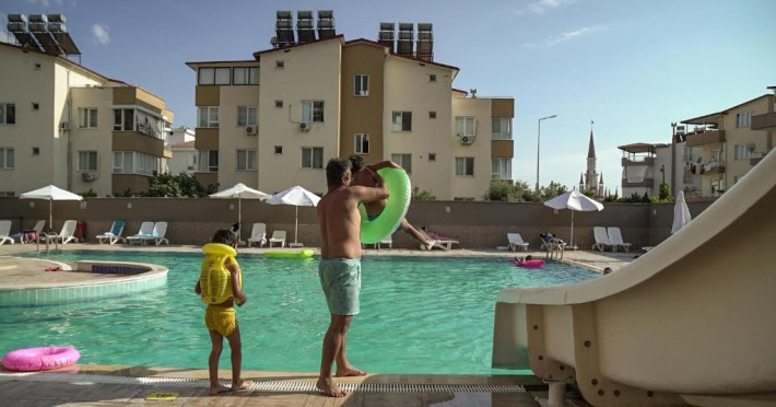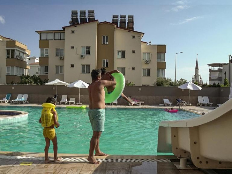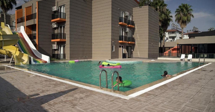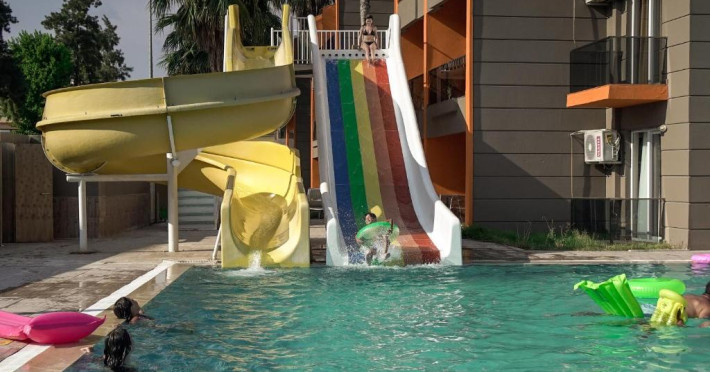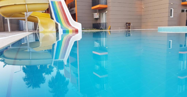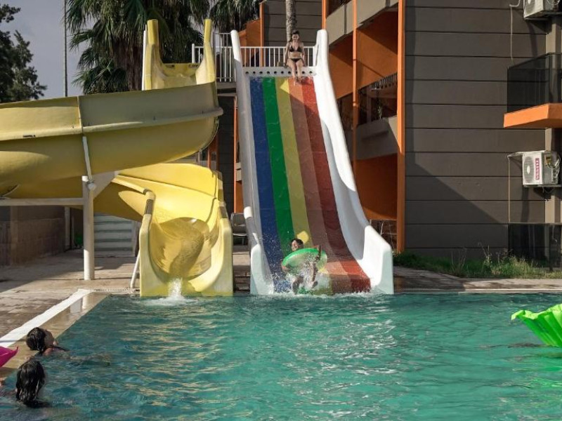 Copiii se pot distra la piscina special amenajată, prevăzută cu tobogane cu apă.