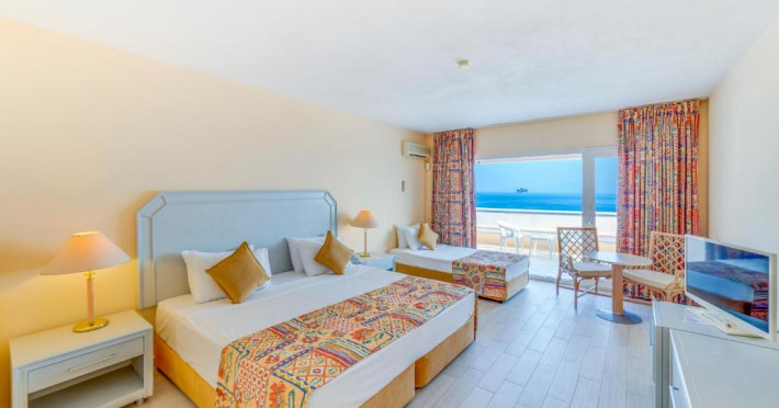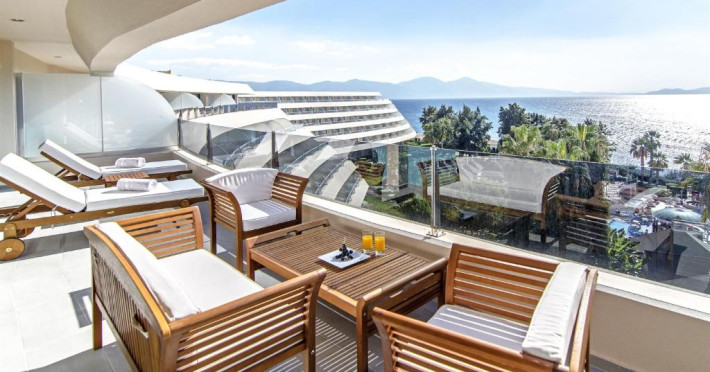Facilitate camere: hotelul pune la dispozitia turistilor un numar total de 319 camere ( 313 camere standard si 6 grand suite) toate cu vedere la mare.Camerele standard au o suprafata cuprinsa intre 35 mp si 50 mp si sunt dotate cu mini bar, LCD TV, aer conditionat split, baie cu cada si uscator de par, telefon direct, seif, acces wi-fi.Grand Suite au o suprafata de 100 mp cu vedere panoramica asupra marii si piscinei, format din doua camere, living si dormitor, si dotat cu terasa cu umbreluta si sezlonguri, mini bar, bucatarie deschisa cu fiebator de cafea si plita, facilitate pentru prepararea ceaiului si cafelei, Tv LCD in ambele camere, aer conditionat, telefon direct, seif, TV prin satelit, acces wi-fi, baie cu dus si cada, uscator de par.