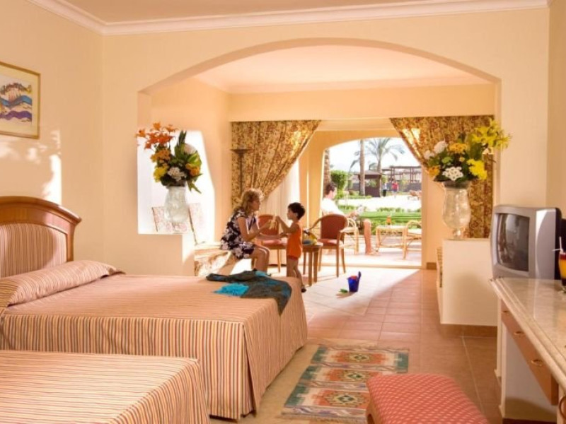 Vederea panoramica a Marii Rosii / Insulei Tiran, vizibila de pe terasa larga a camerei, ofera un aer romantic interiorului elegant.