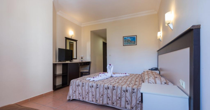 Unele camere au balcon cu vedere la grădină sau la piscină. În camere există baie cu cadă sau duș ce are în dotare foehn și articole de toaletă gratuite. Fiecare cameră dispune de minibar. Camerele confortabile de la Helios Hotel au pardoseală de gresie/ marmură, aer condiționat, Tv cu canale prin satelit și seif. Oaspeții au acces gratuit la serviciul Wi-fi în camere. Curățenia in cameră se face zilnic. Toate camerele spațioase de la Helios Hotel au zonă de relaxare cu canapea, ceea ce oferă un plus de confort. Proprietatea oferă camere pentru familie cu o suprafață mai mare și un număr mai mare de paturi față de cele standard. Se pot rezerva de asemenea camere pentru nefumători.