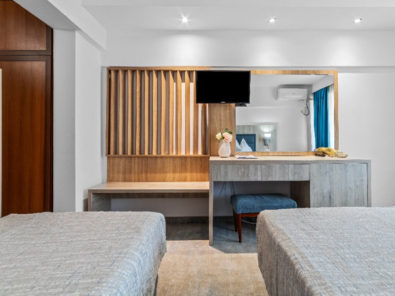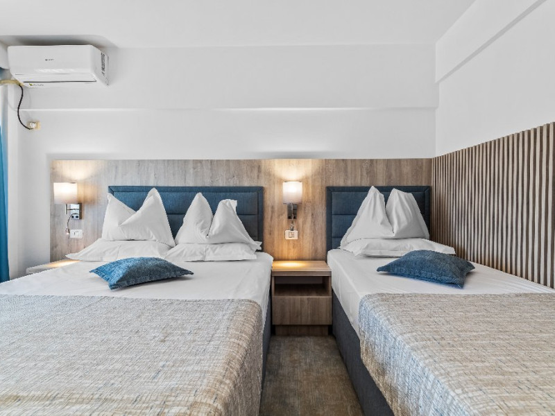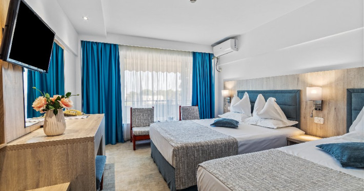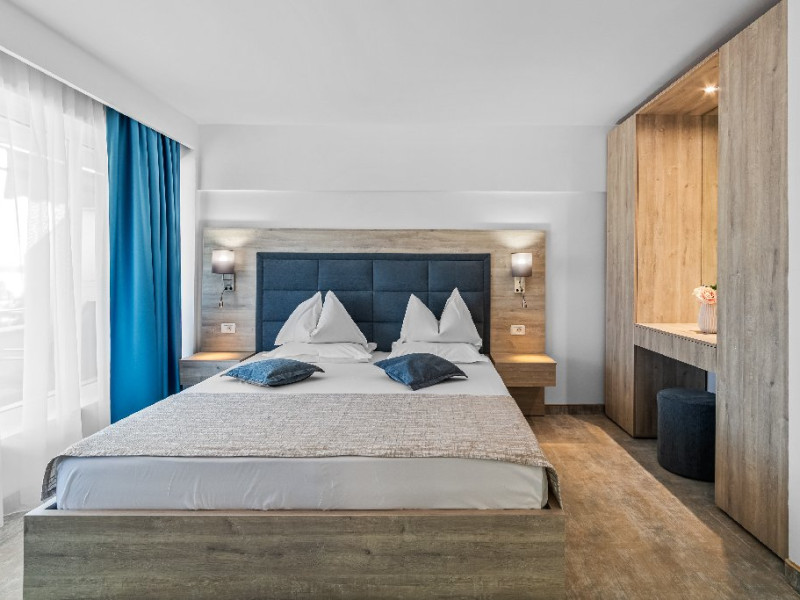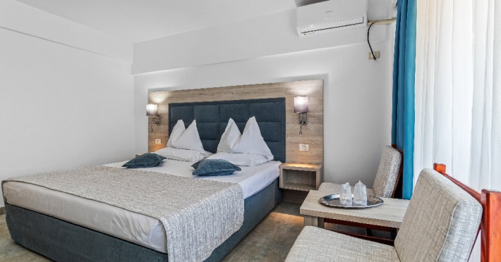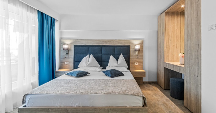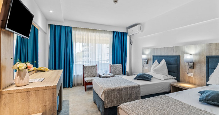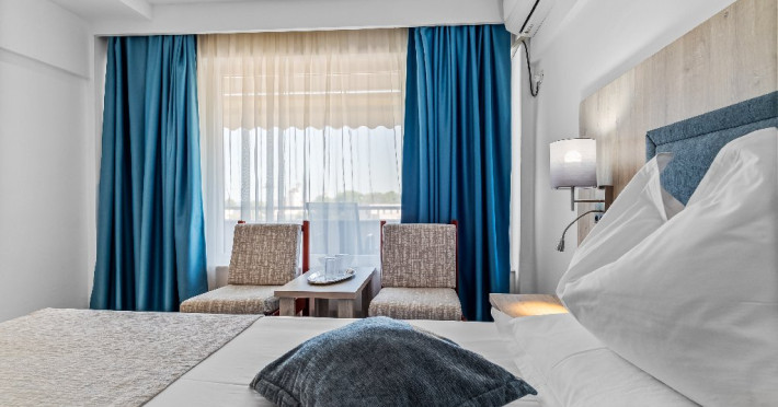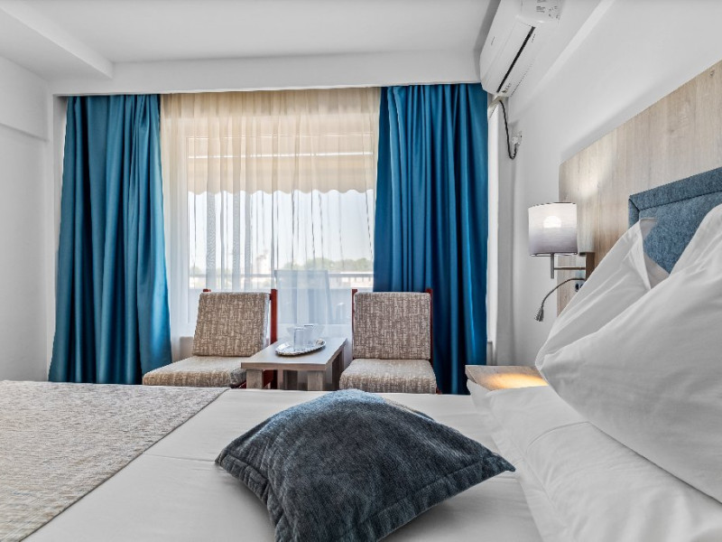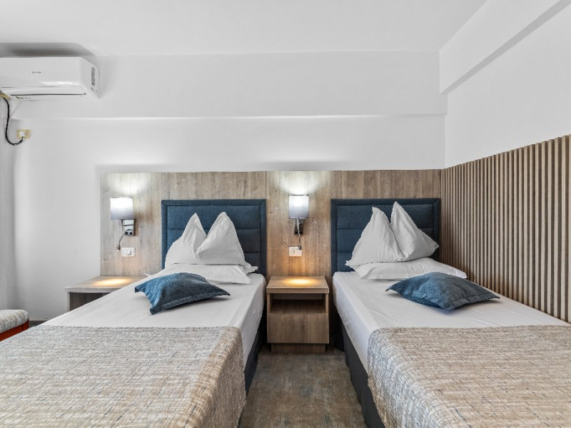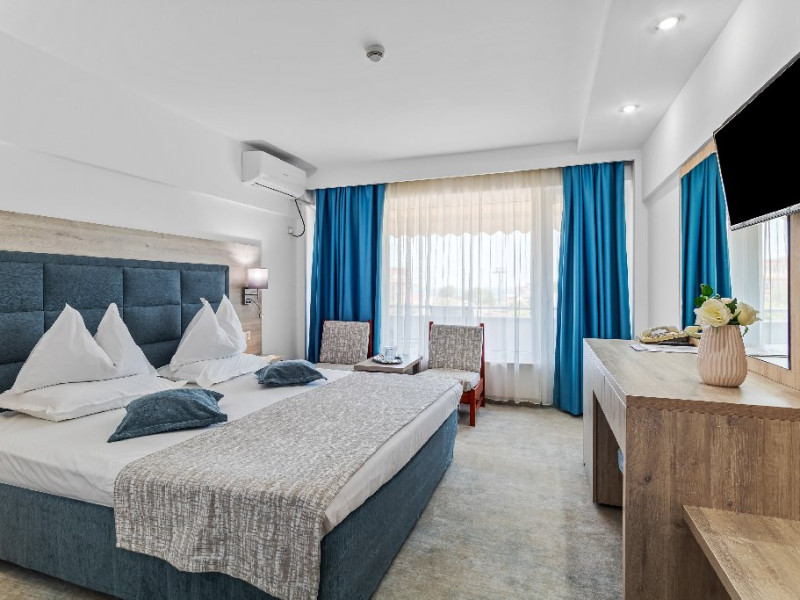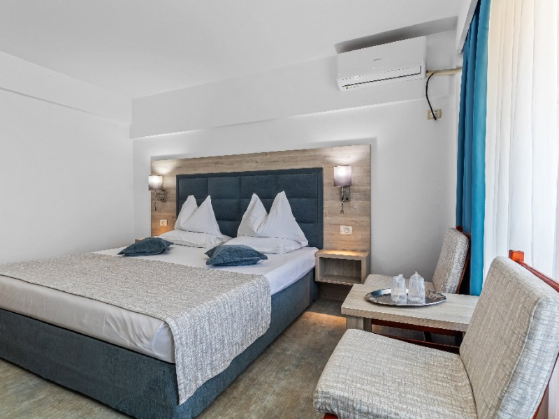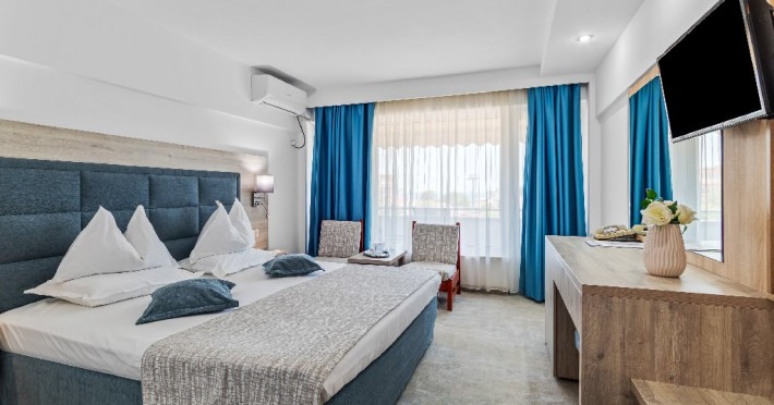 DESCRIERE CAMERE Dotari camere: aer conditionat, smart TV, minibar, seif, baie cu dus si telefon, balcon, internet -wireless, hatale, papuci camera, uscator de par, telefon, acces pe baza de cartela magnetica. Numar total camere: 139 Camere single: 6 (suprafata de 17 mp, dispun de 1 pat single cu dimensiunea de 90/ 200 cm) Camere Duble: 111 (suprafata de 22 mp, dispun de 1 pat matrimonial cu dimensiunea de 140/ 200 cm sau 2 paturi twin fiecare cu dimensiunea de 90/ 200 cm) Camere Triple: 20 (suprafata de 25 mp, au in dotare 1 pat matrimonial de 140/ 200 cm si 1 pat single cu dimensiunea de 90/ 200 cm) Apartamente: 2 (suprafata de 45 mp, este compus din living cu canapea extensibila si dormitor cu pat matrimonial, detine terasa cu sezlonguri).