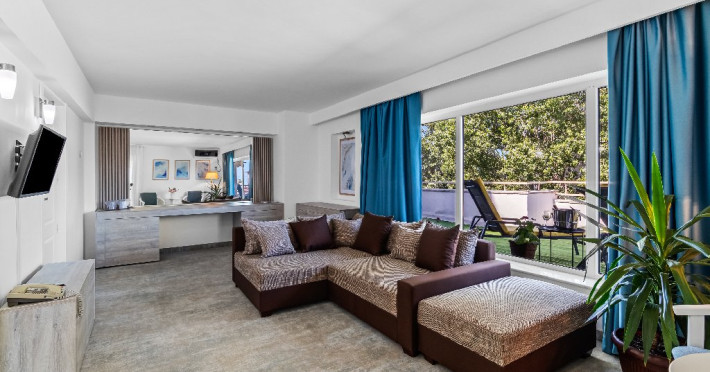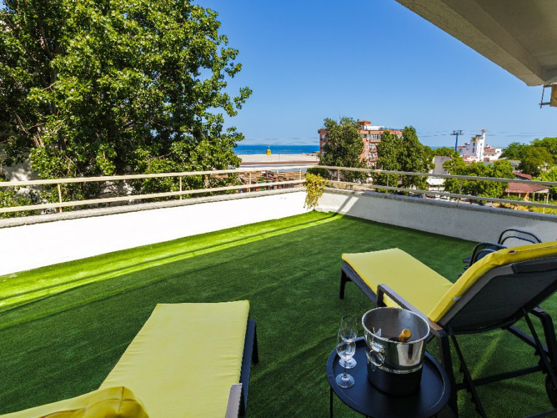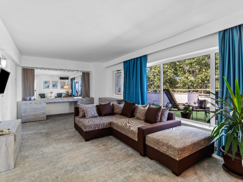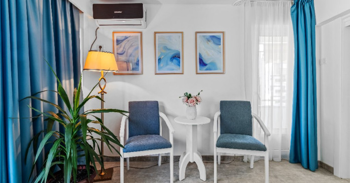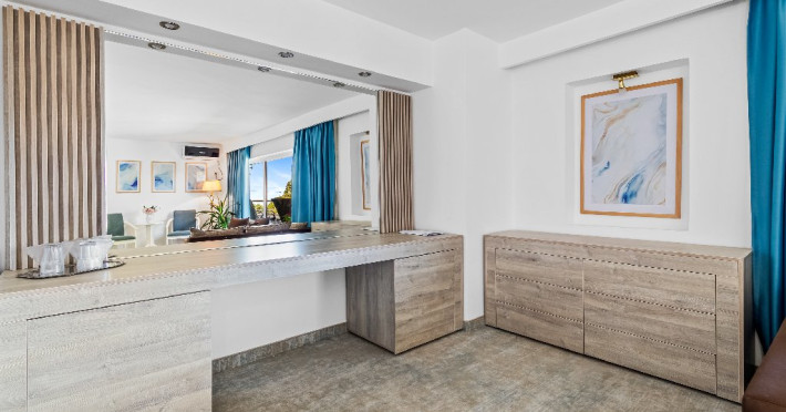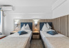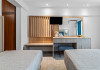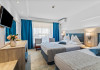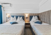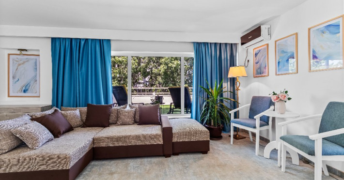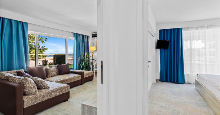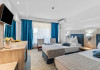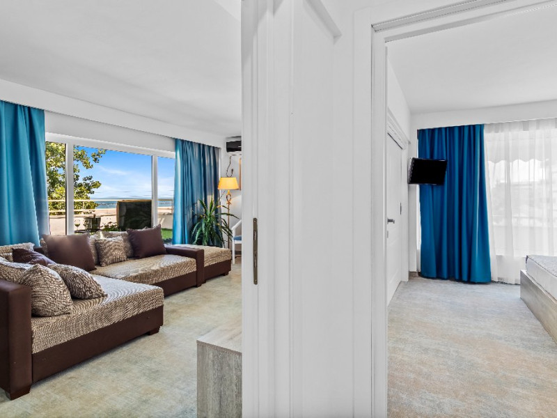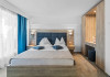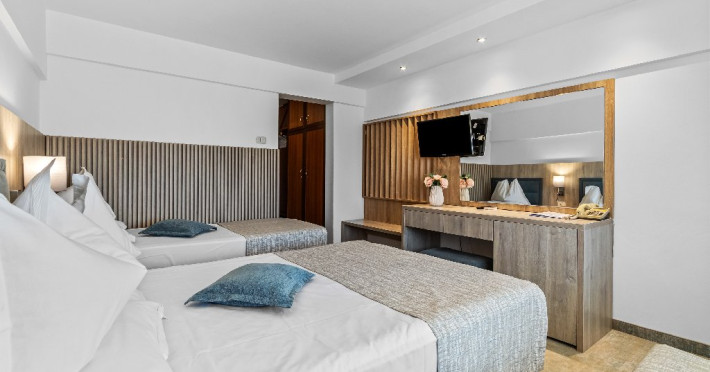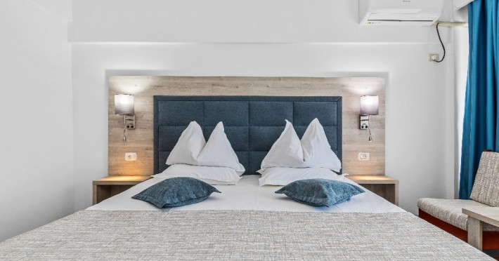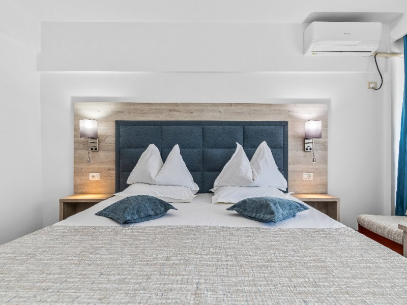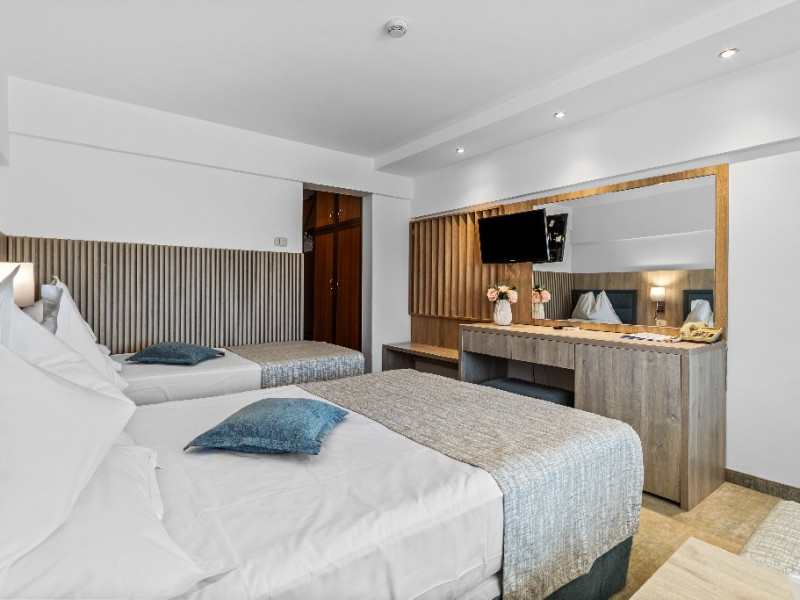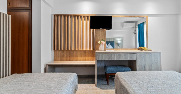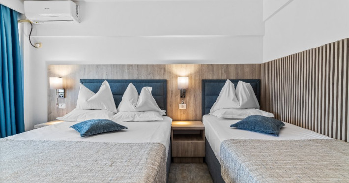 DESCRIERE CAMERE Dotari camere: aer conditionat, smart TV, minibar, seif, baie cu dus si telefon, balcon, internet -wireless, hatale, papuci camera, uscator de par, telefon, acces pe baza de cartela magnetica. Numar total camere: 139 Camere single: 6 (suprafata de 17 mp, dispun de 1 pat single cu dimensiunea de 90/ 200 cm) Camere Duble: 111 (suprafata de 22 mp, dispun de 1 pat matrimonial cu dimensiunea de 140/ 200 cm sau 2 paturi twin fiecare cu dimensiunea de 90/ 200 cm) Camere Triple: 20 (suprafata de 25 mp, au in dotare 1 pat matrimonial de 140/ 200 cm si 1 pat single cu dimensiunea de 90/ 200 cm) Apartamente: 2 (suprafata de 45 mp, este compus din living cu canapea extensibila si dormitor cu pat matrimonial, detine terasa cu sezlonguri).
