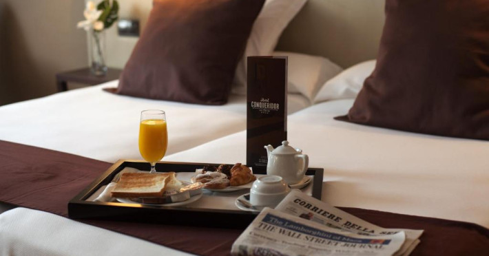 Restaurantul Hotelului Conqueridor este situat la parter și oferă un mic dejun variat. Seara, oferă versiuni moderne ale preparatelor spaniole clasice.