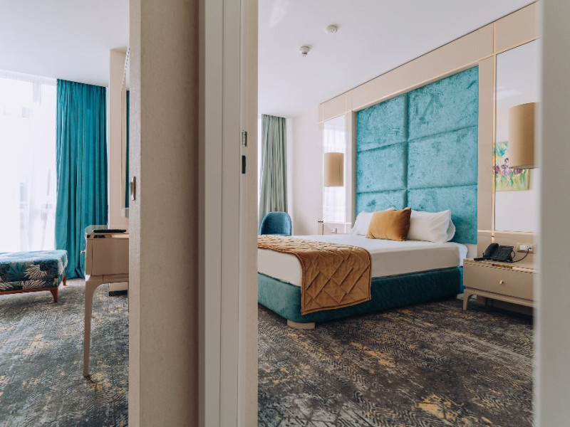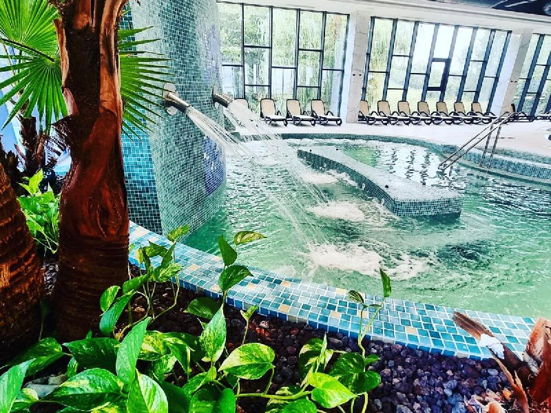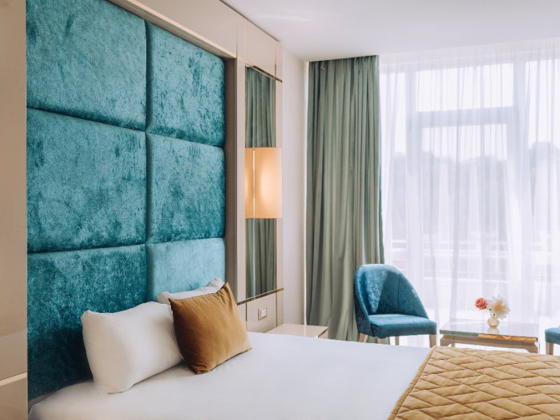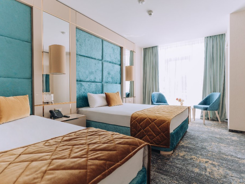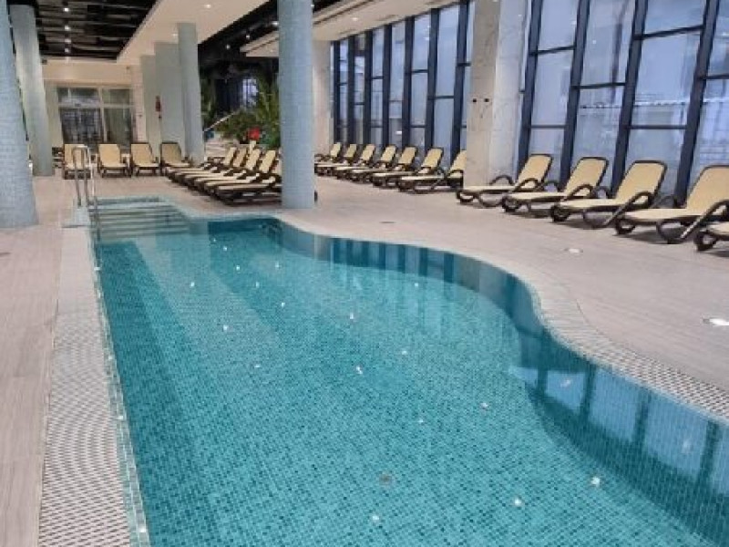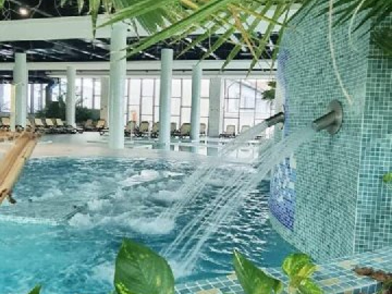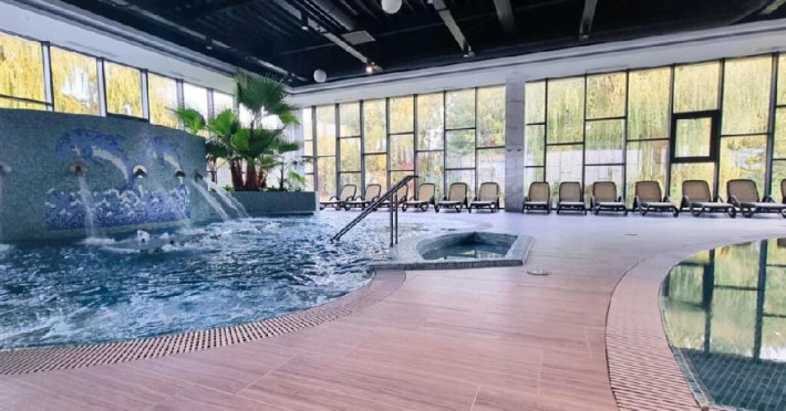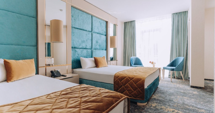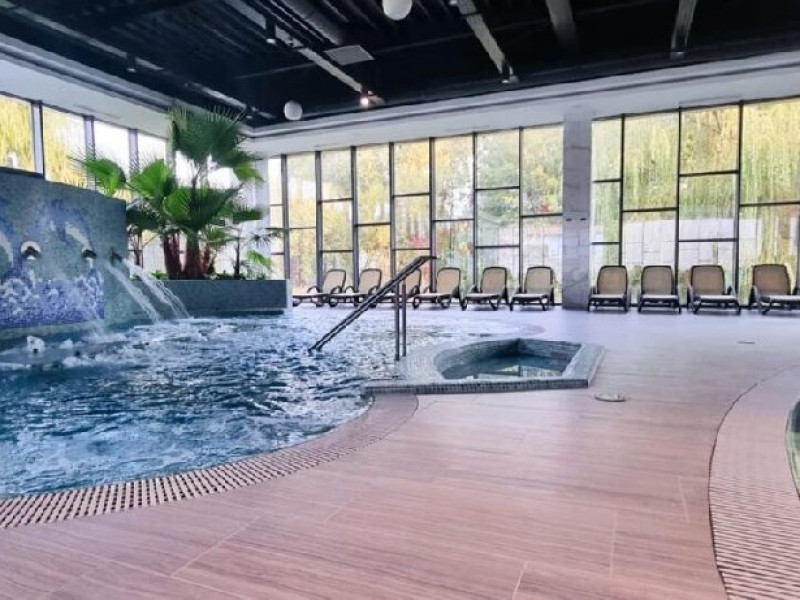 DESCRIERE UNITATE DE CAZARE: La dispozitia turistilor sunt 4 bazine exterioare, 6 bazine interioare, 3 tipuri de sauna, 13 tipuri de tratamente de recuperare, 2 terase, restaurant si lobby bar, 2 sali de conferinta, 1 sala de fitness, teren de fotbal, centru de wellness si SPA. o statie de incarcare pentru auto electrice.