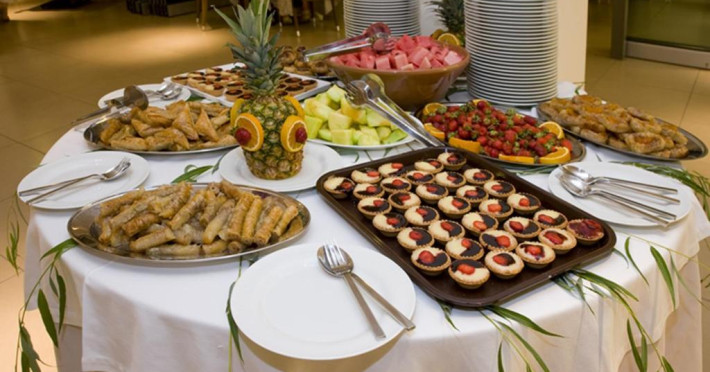 La Island Blue Hotel oaspeții au la dispoziție un restaurant care servește mâncare în stil bufet. Preparate din bucătăria grecească și internațională așteaptă să fie degustate în fiecare zi la micul dejun, prânz și cină. Masa poate fi servită atât în interior, cît si în aer liber, pe terasă, în funcție de vreme. Oaspeţii pot avea diverse băuturi răcoritoare sau alcoolice la bar. Pentru cei cu anumite nevoi de nutriție, Island Blue Hotel oferă meniuri pentru diete speciale.