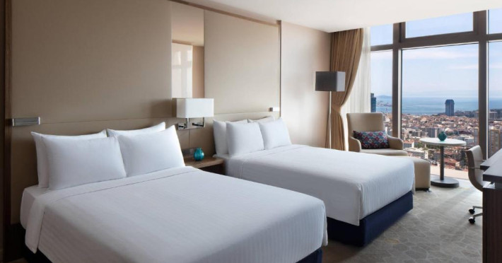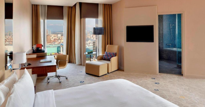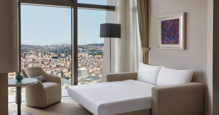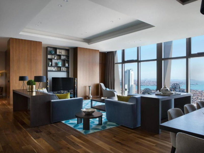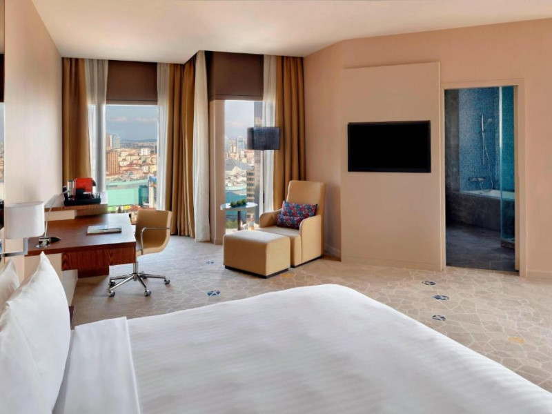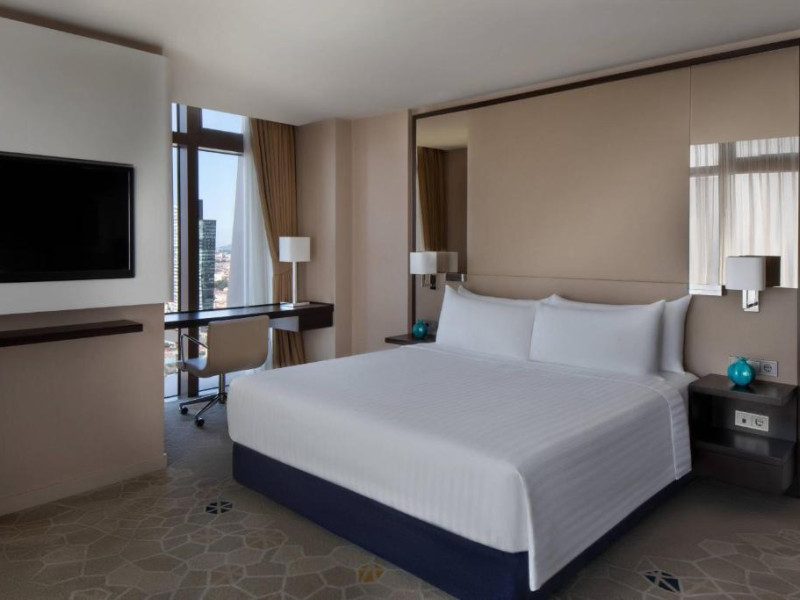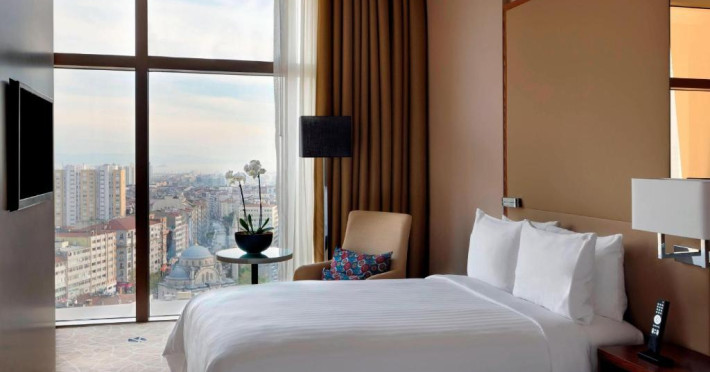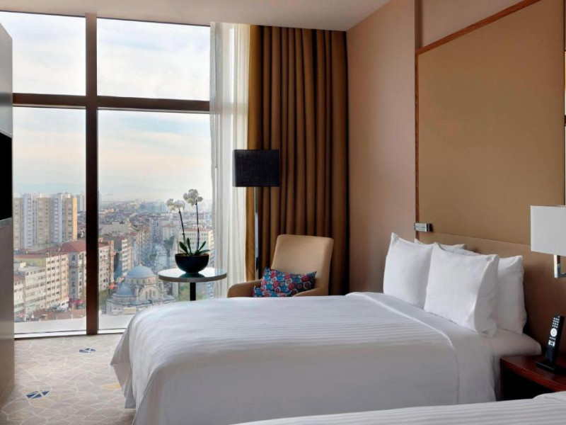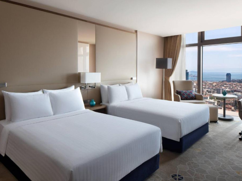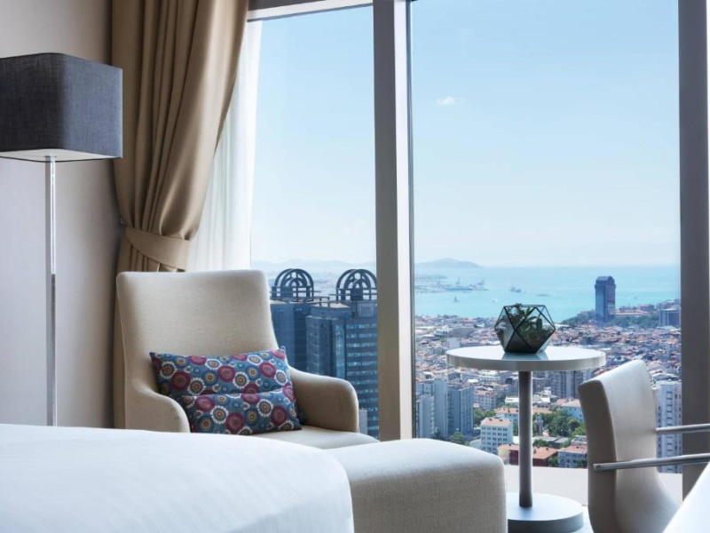 Camerele elegante combină confortul specific lanțului Marriott cu elemente de design contemporan. Ferestrele panoramice oferă perspective impresionante asupra orașului și Bosforului. The Dish Room Restaurant servește preparate din bucătăria turcească și internațională, iar The Terrace Bar este locul ideal pentru cocktailuri cu priveliști panoramice.