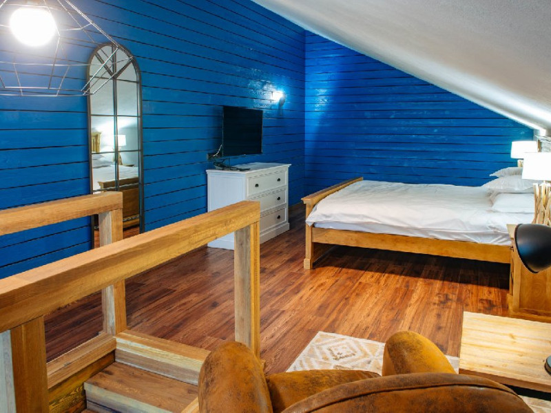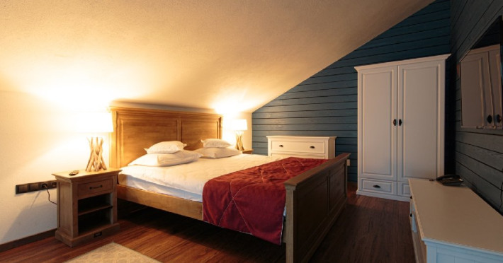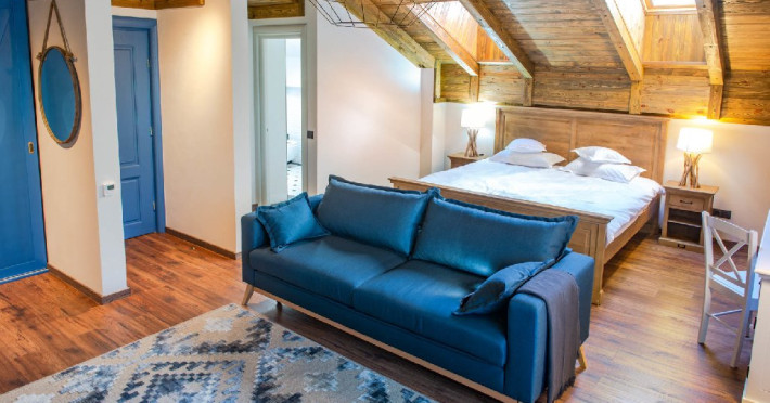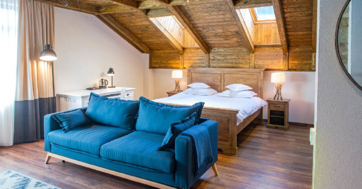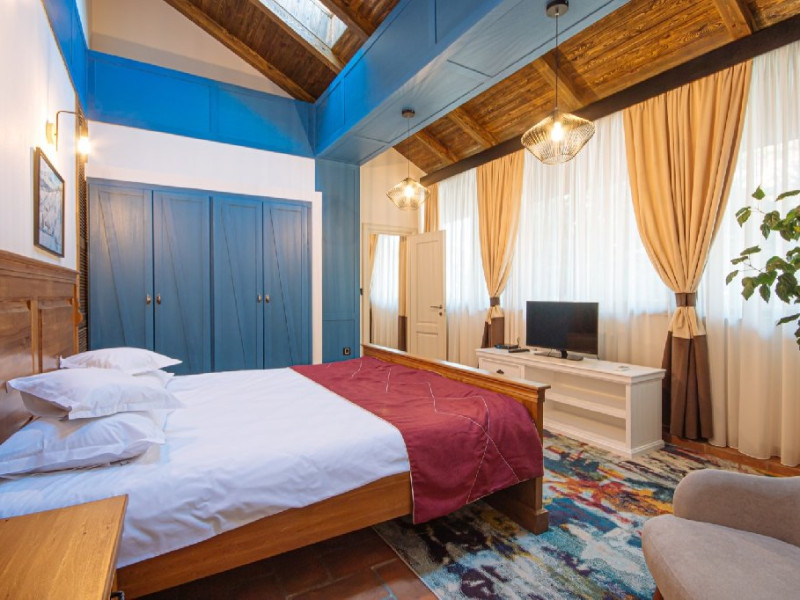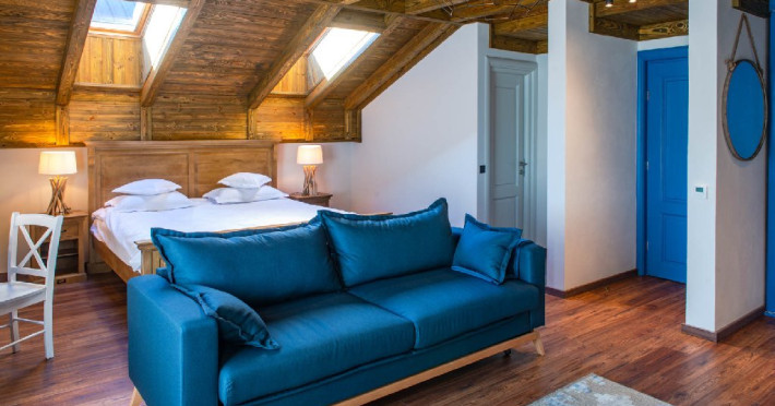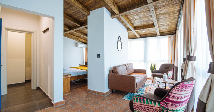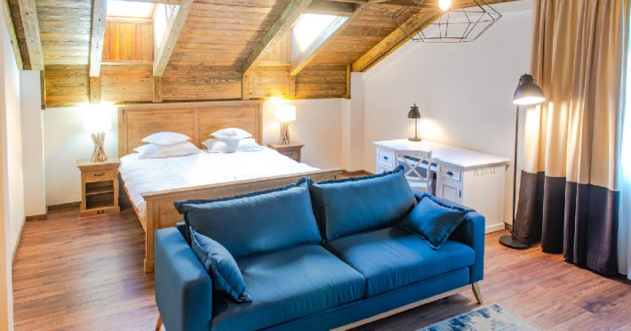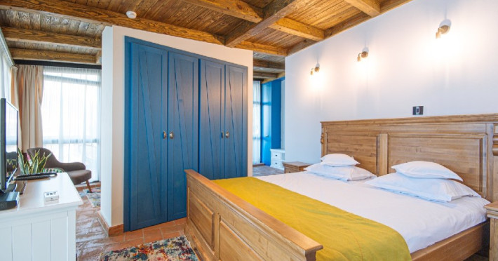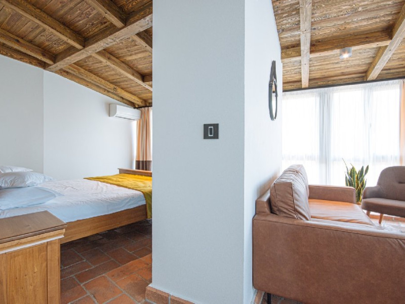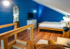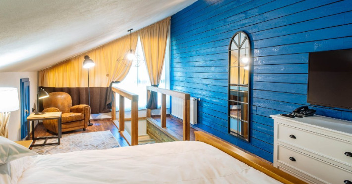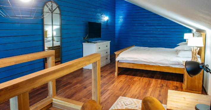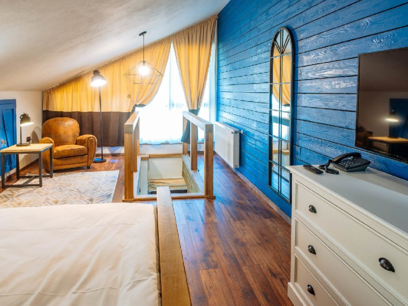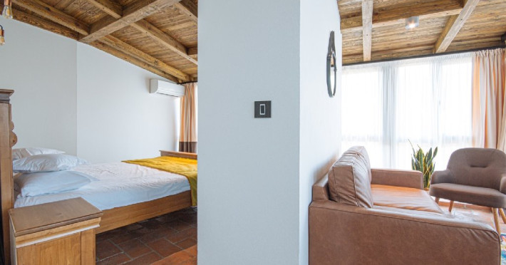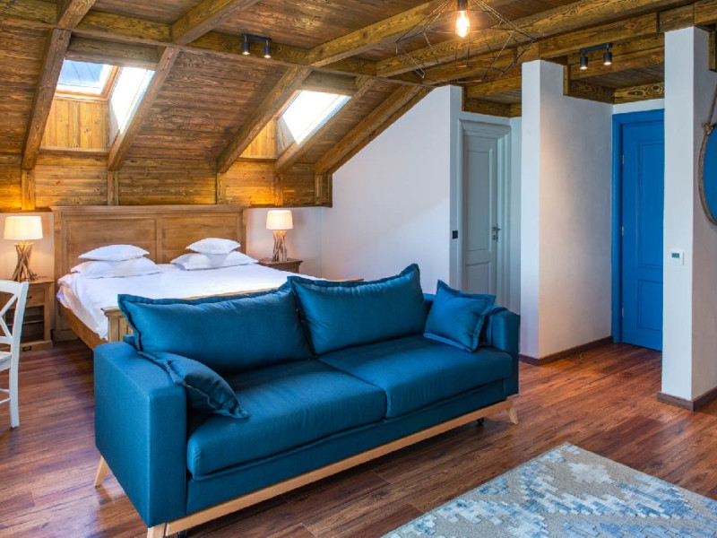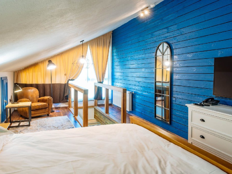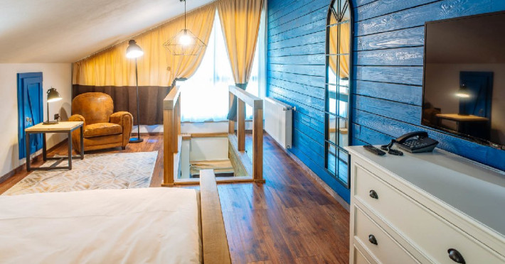 Camera dubla Superior - cu un design primitor, are o scara interioara, la primul nivel fiind baia si o canapea extensibila, iar la mansarda dormitorul cu un pat king bed. Suprafata de 35 mp, cu balcon.