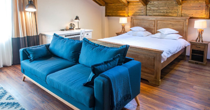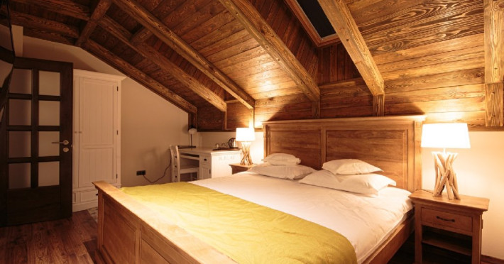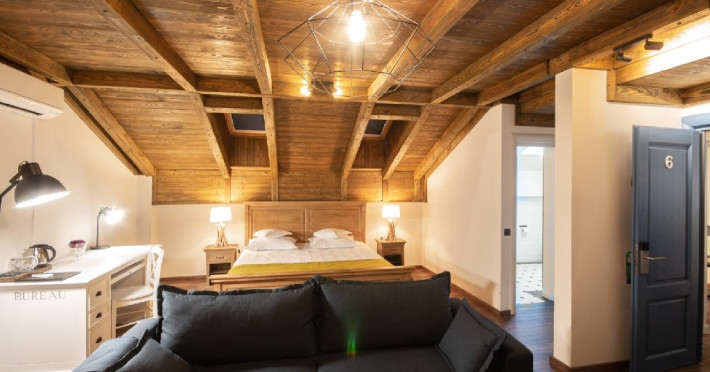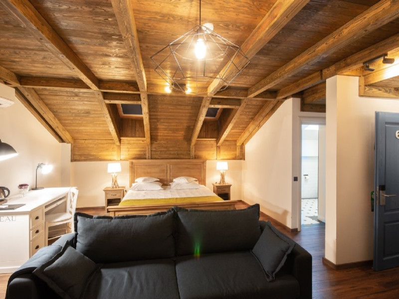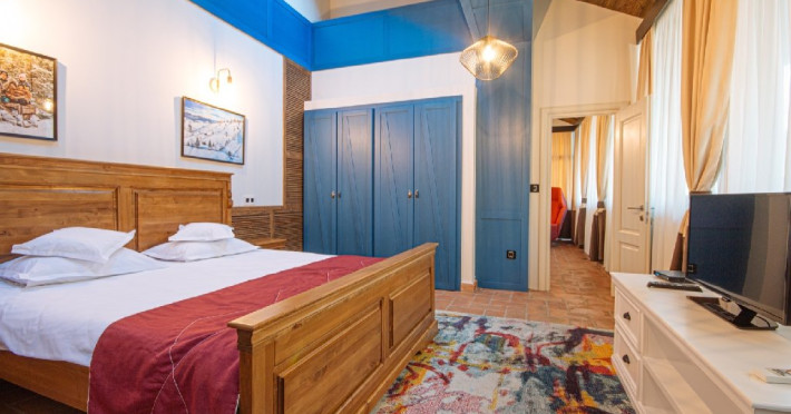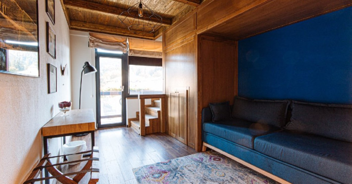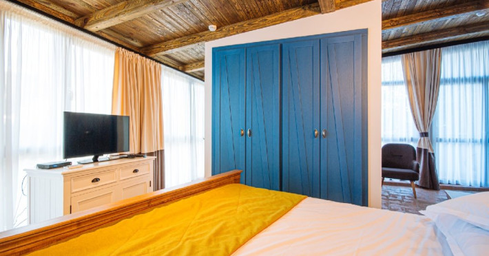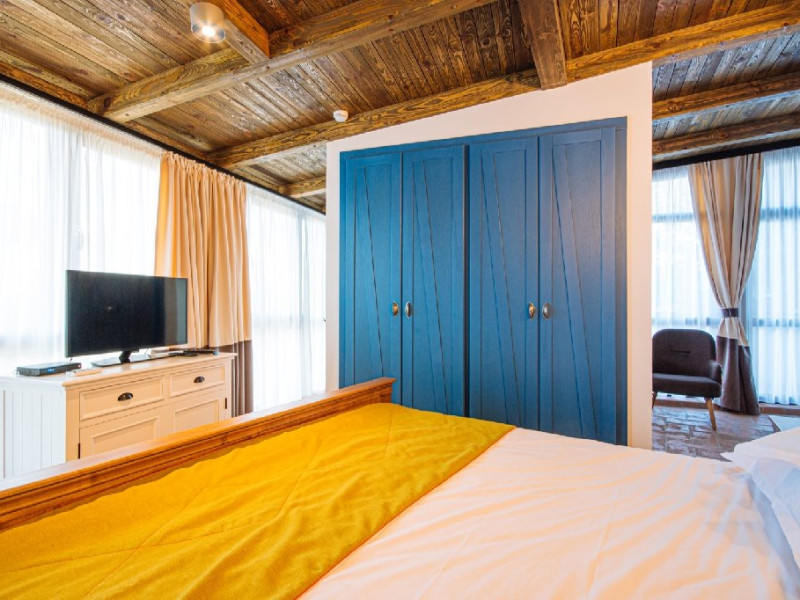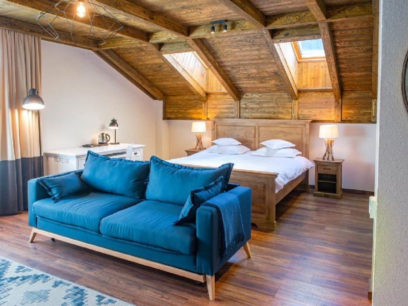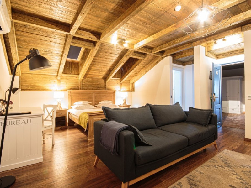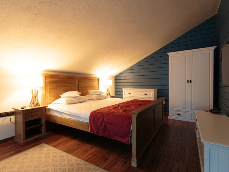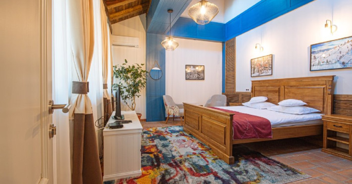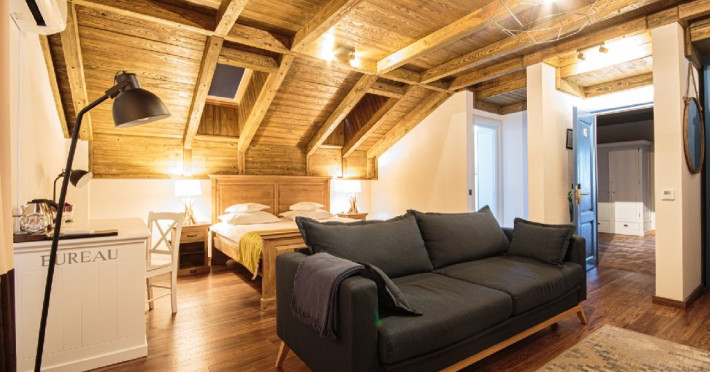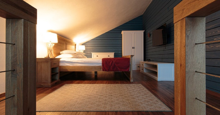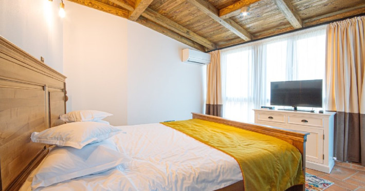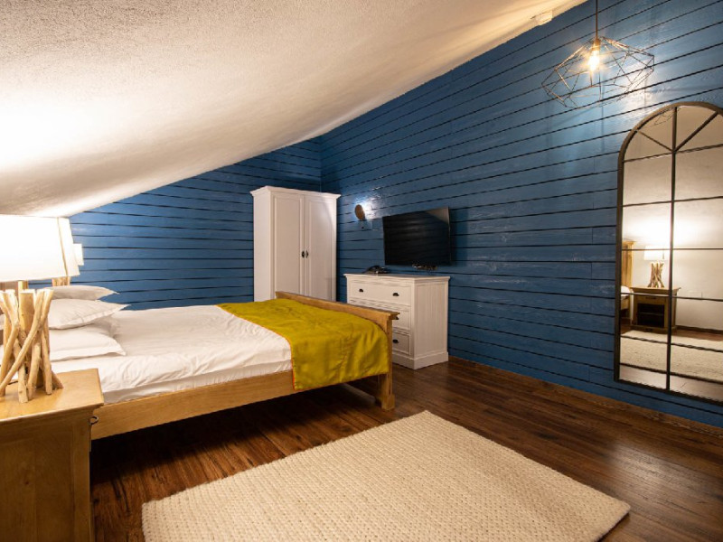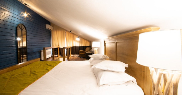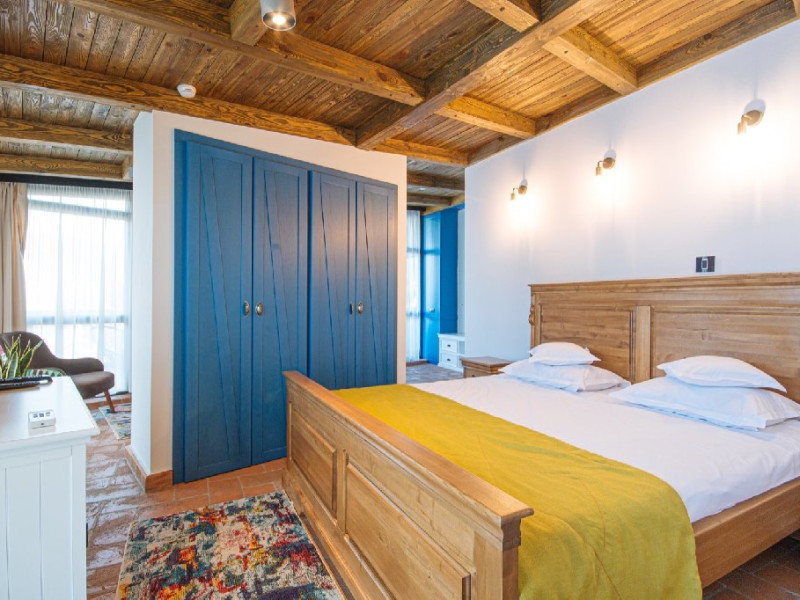Camera dubla Superior - cu un design primitor, are o scara interioara, la primul nivel fiind baia si o canapea extensibila, iar la mansarda dormitorul cu un pat king bed. Suprafata de 35 mp, cu balcon.