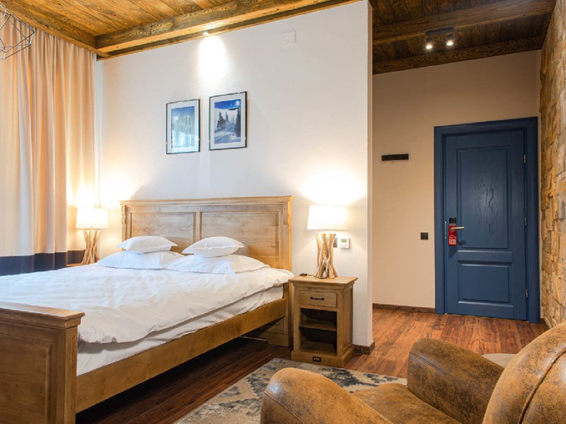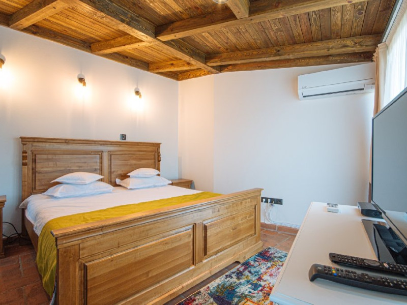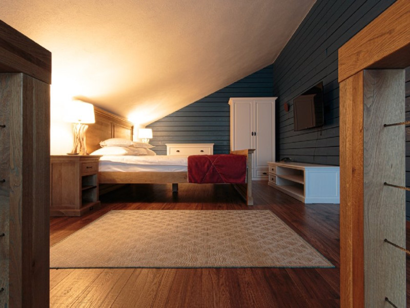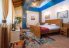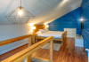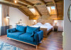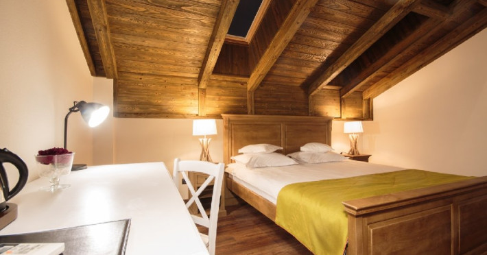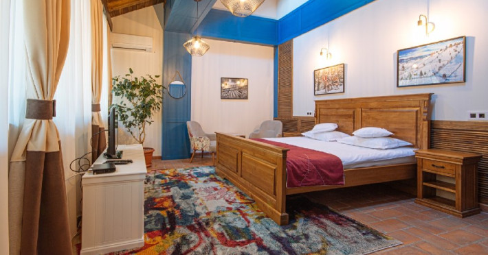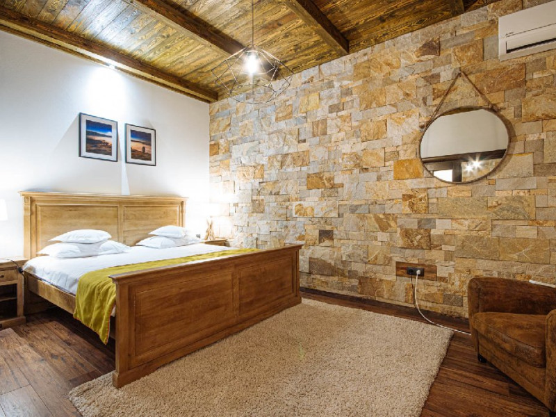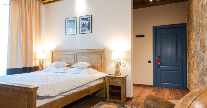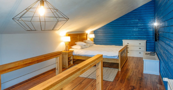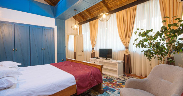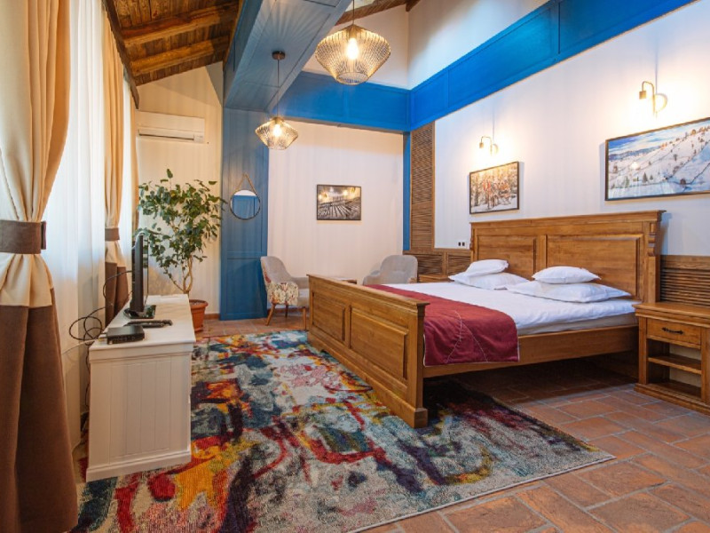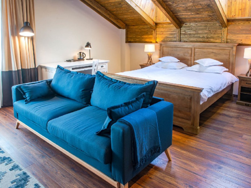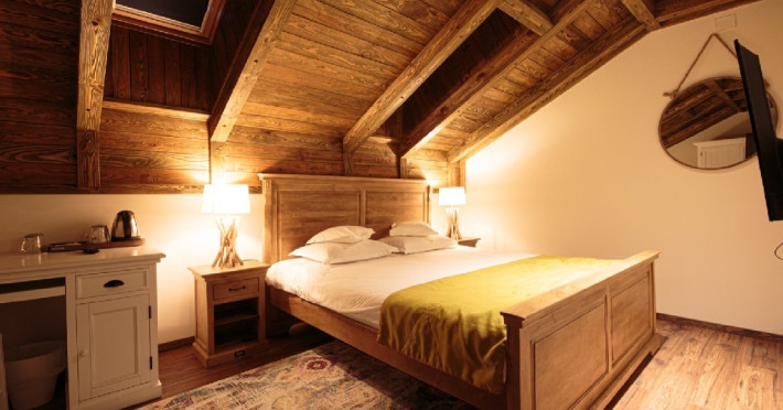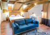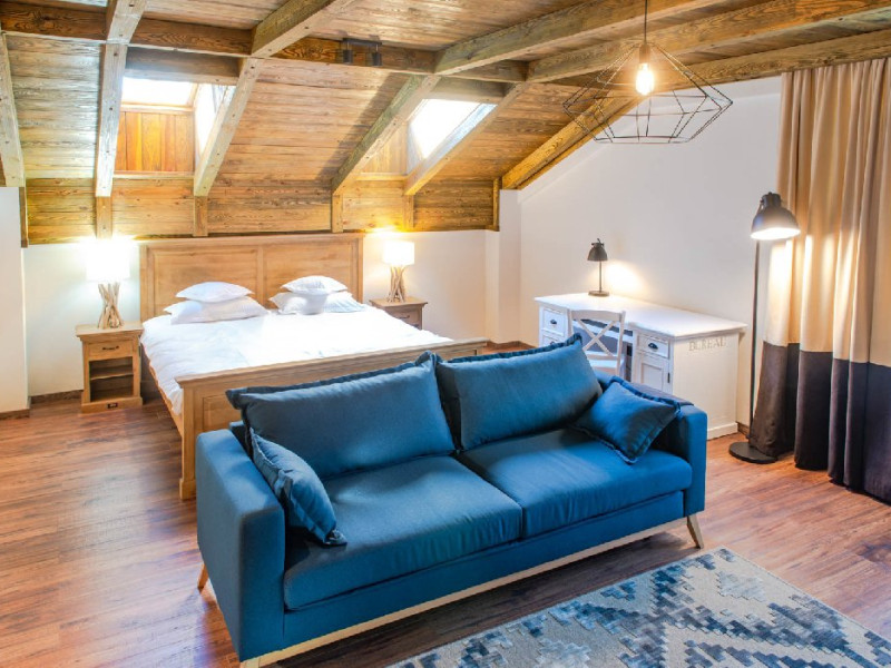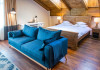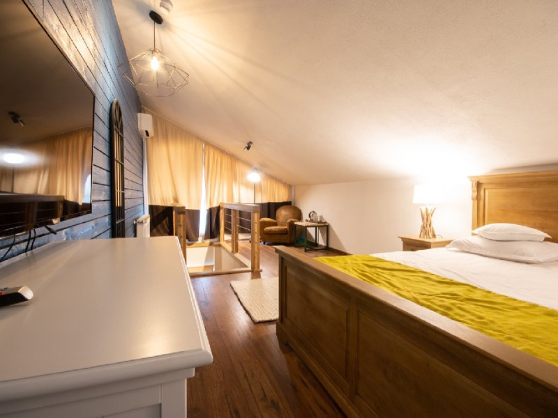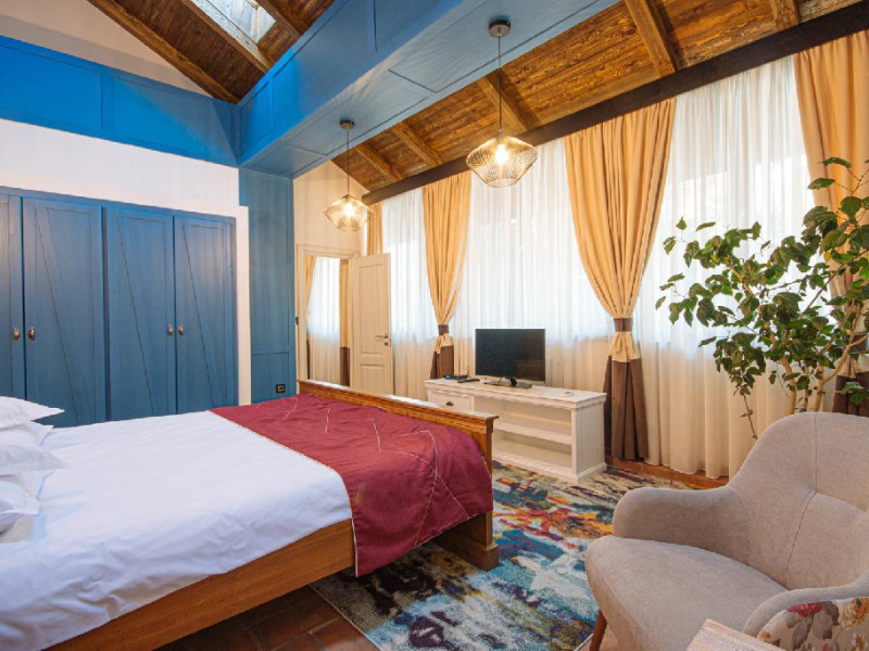 Camera dubla Superior - cu un design primitor, are o scara interioara, la primul nivel fiind baia si o canapea extensibila, iar la mansarda dormitorul cu un pat king bed. Suprafata de 35 mp, cu balcon.
