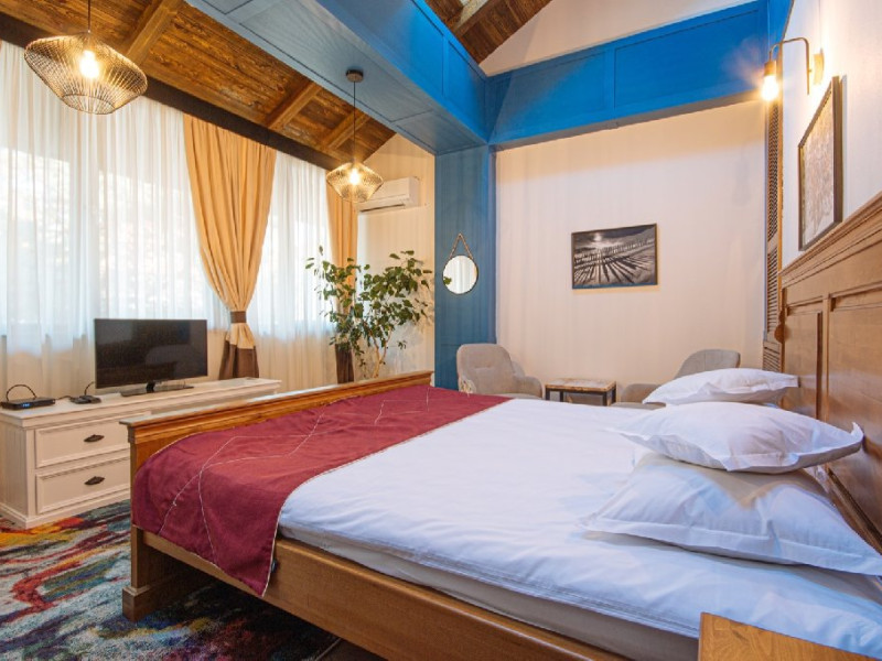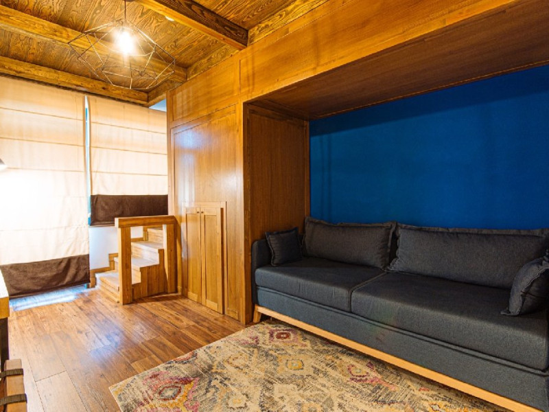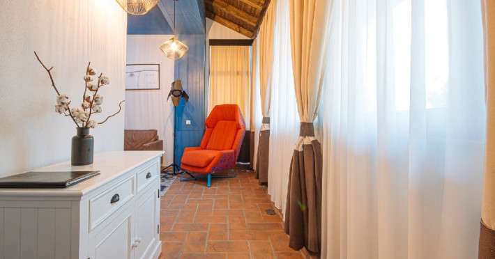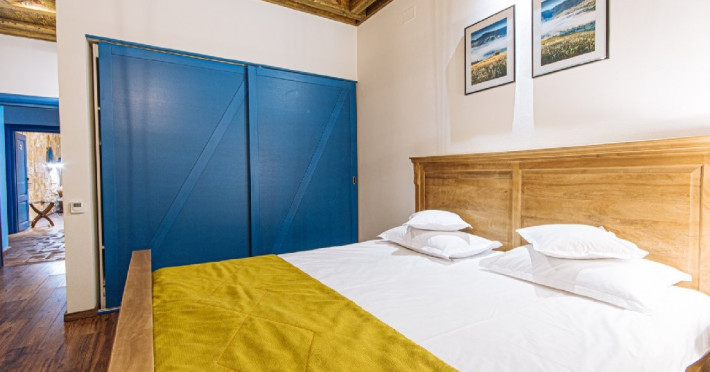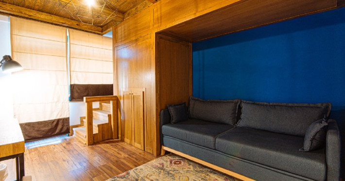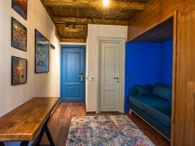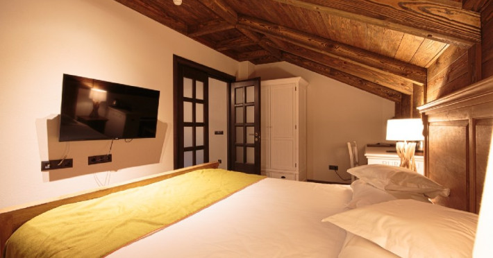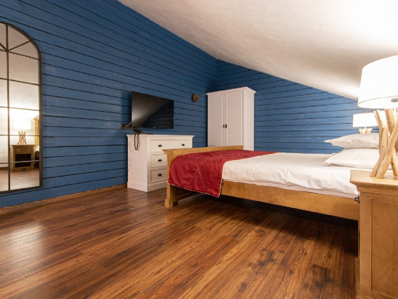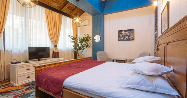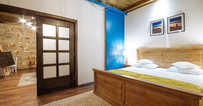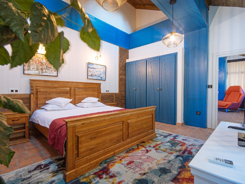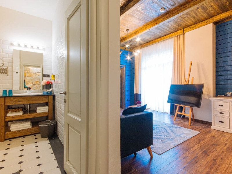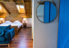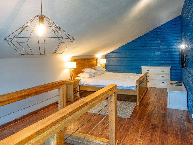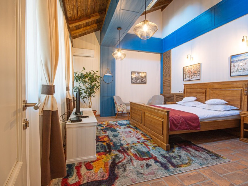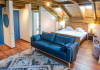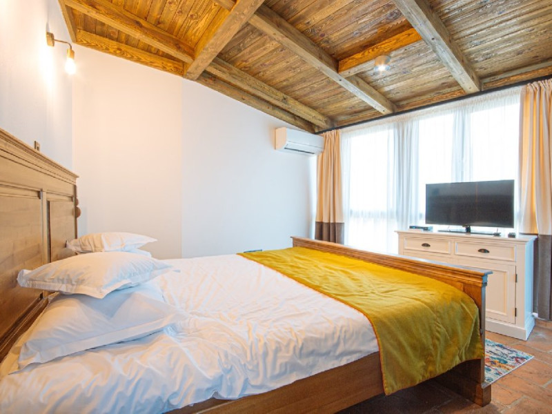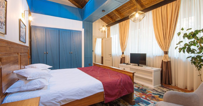 Camera dubla Superior - cu un design primitor, are o scara interioara, la primul nivel fiind baia si o canapea extensibila, iar la mansarda dormitorul cu un pat king bed. Suprafata de 35 mp, cu balcon.