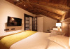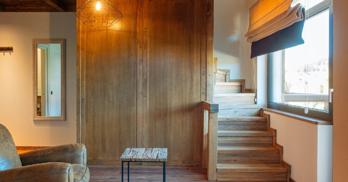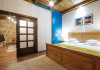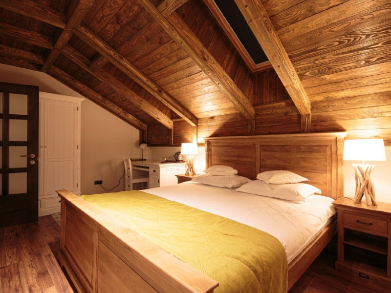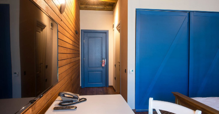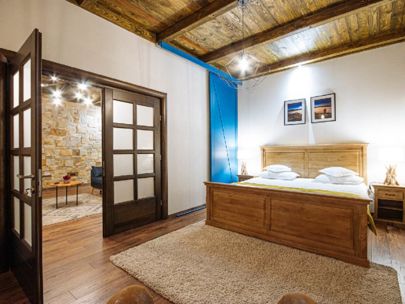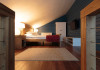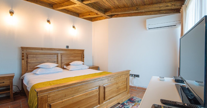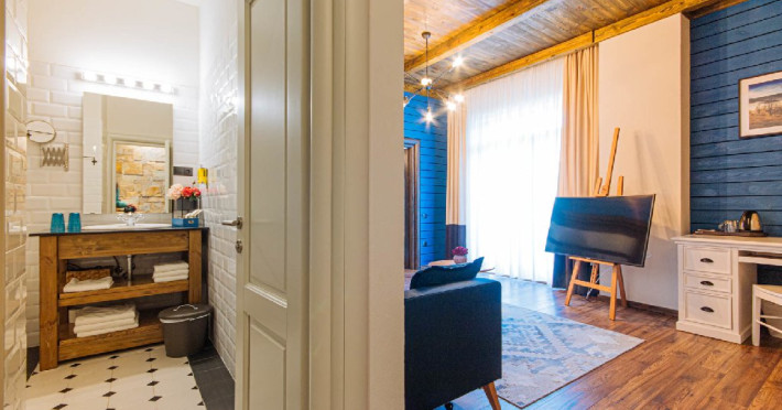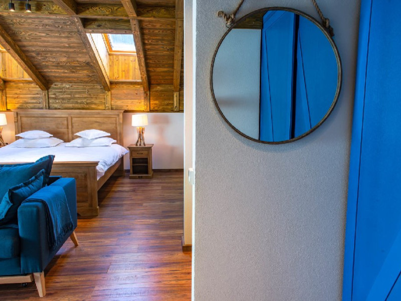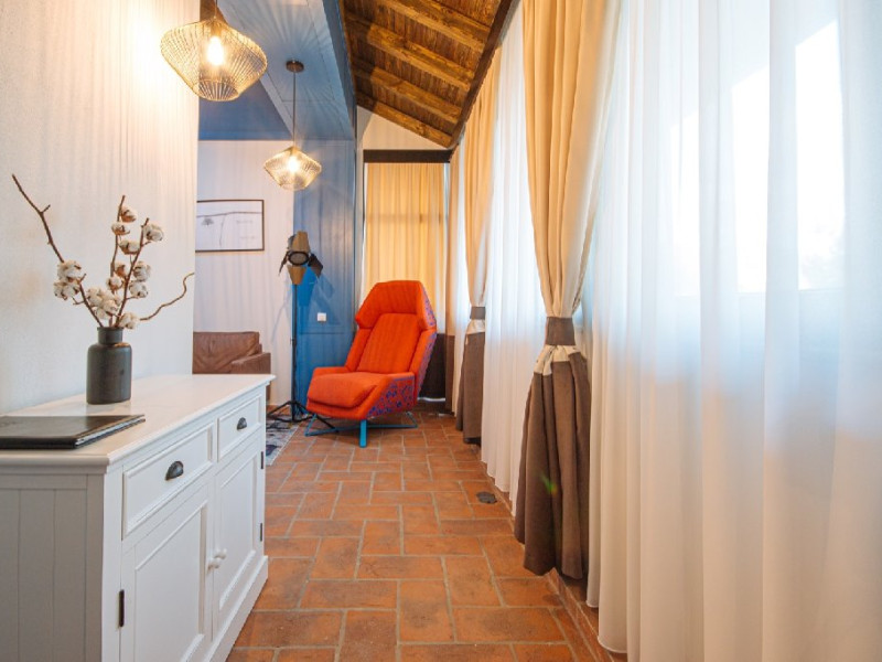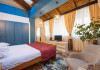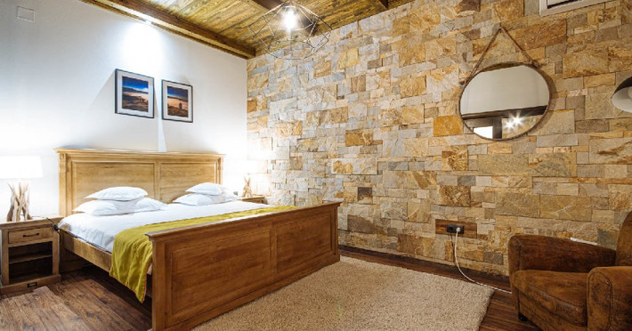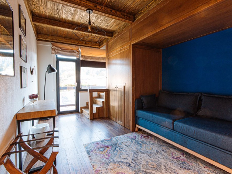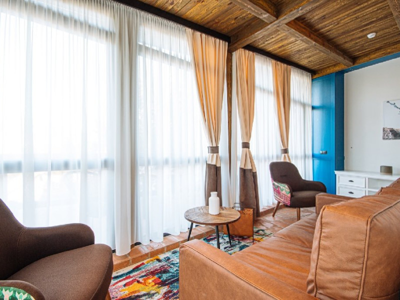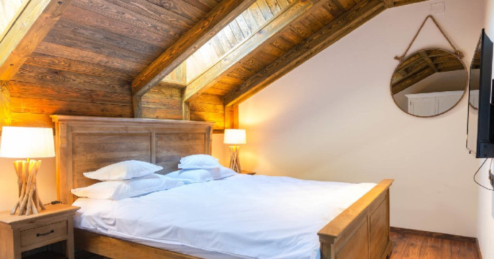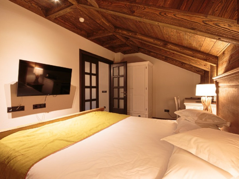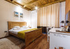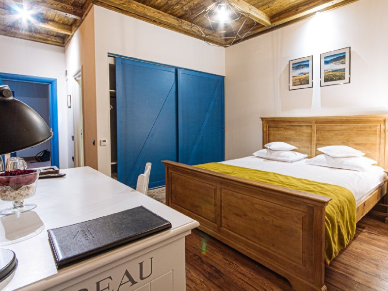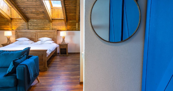 Camera dubla Superior - cu un design primitor, are o scara interioara, la primul nivel fiind baia si o canapea extensibila, iar la mansarda dormitorul cu un pat king bed. Suprafata de 35 mp, cu balcon.
