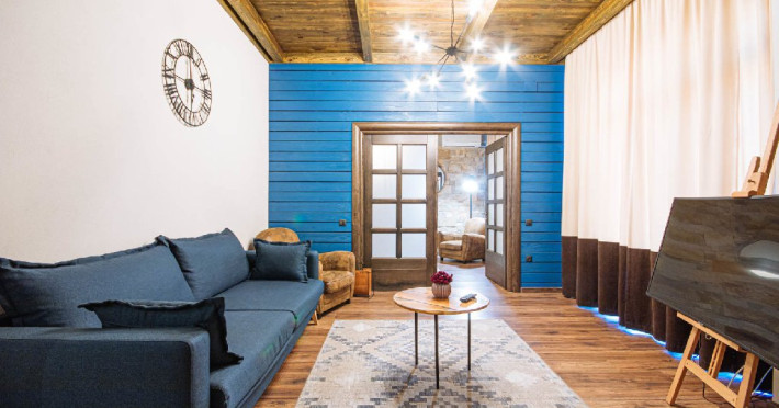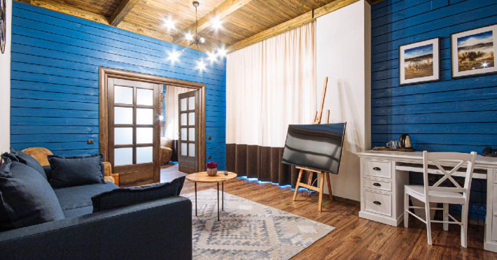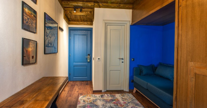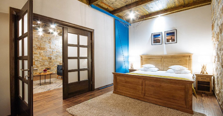 Suita family - cu suprafata de 60 mp, cu balcon. Situata pe doua niveluri, cu scara interioara, avand doua dormitoare distincte cu paturi duble extra-large, cochet aranjate, ce impart un living comun.