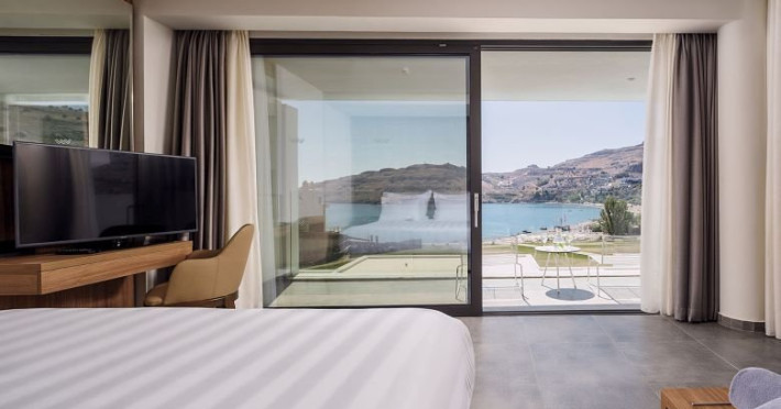 CAMERE: Doua tipuri de spatii de cazare: camera dubla sau apartament. Camera dubla are balcon/terasa cu vedere la mare/gradina si poate avea si piscina privata. Apartamentul are balcon/terasa cu vedere la mare/gradina si poate avea si piscina privata, iar in zona de living o canapea extensibila. Toate camerele pun la dispozitie: balcon/terasa mobilata, televizor, aer conditionat, WiFi, minibar, seif, iar baile sunt dotate cu: cabina de dus/cada, halate si papuci, uscator de par, cosmetice si produse de ingrijire personala Apivita, prosoape de plaja/piscina.