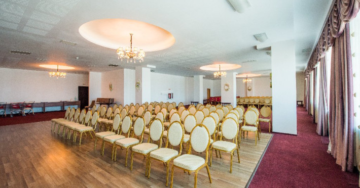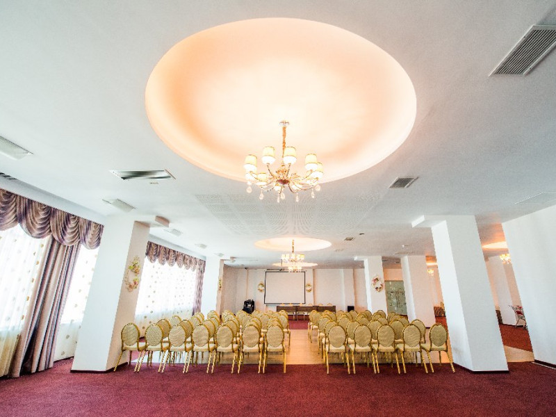 Sali de conferinte: 1. SALA OVIDIU (etaj I) - capacitate maxima de 250 persoane (in aranjament teatru); - echipament complet - flipchart, ecran de proiectie (dimensiunea ecranului 2m x 3m),videoproiector (3.500 lumeni), instalatie sonorizare (1.000 W); - separeu pentru pauza de cafea (cu mese, scaune si canapele).