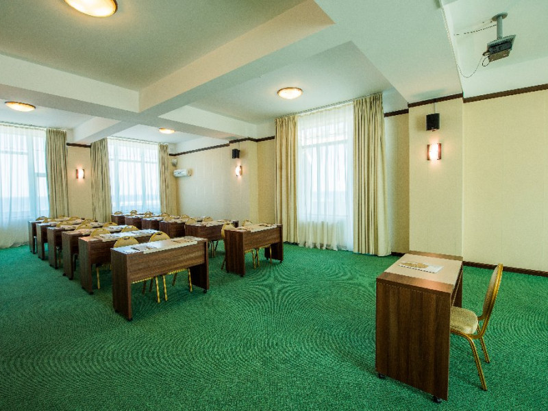 2. SALA CALLATIS (parter) - capacitate maxima de 100 persoane (in aranjament teatru); - echipament complet - flipchart, ecran de proiectie (dimensiunea ecranului 2m x 3m),videoproiector (3.500 lumeni), instalatie sonorizare (1.000 W); - lobby bar pentru servirea pauzelor de cafea.