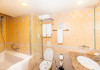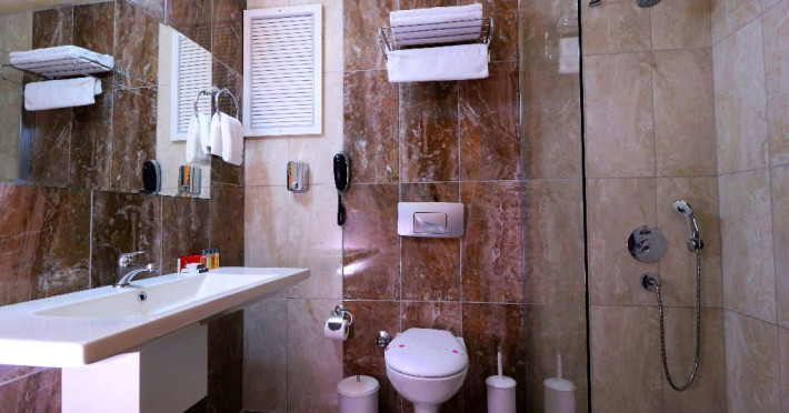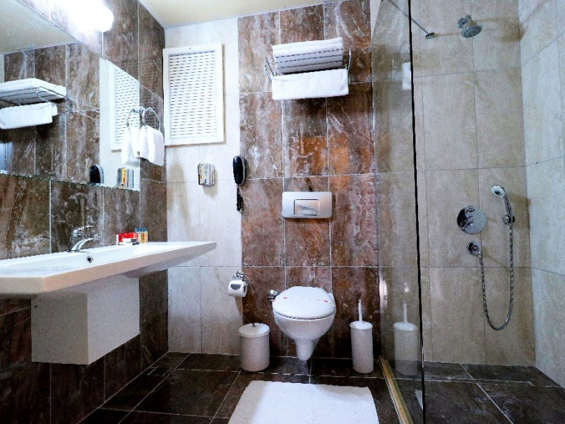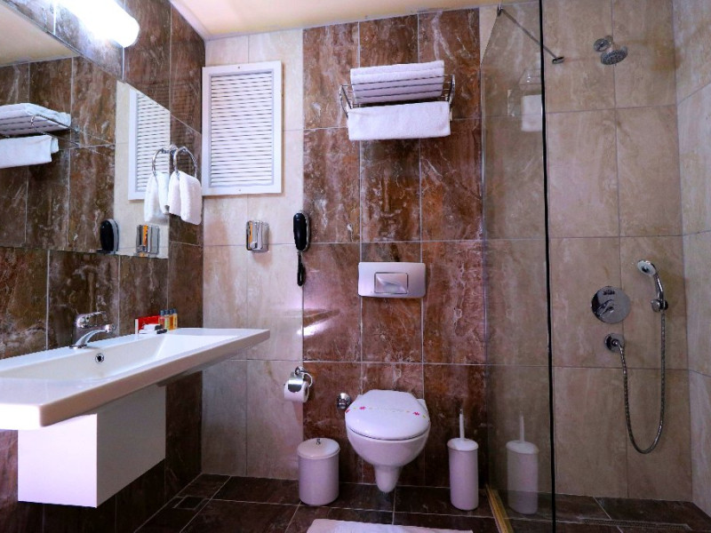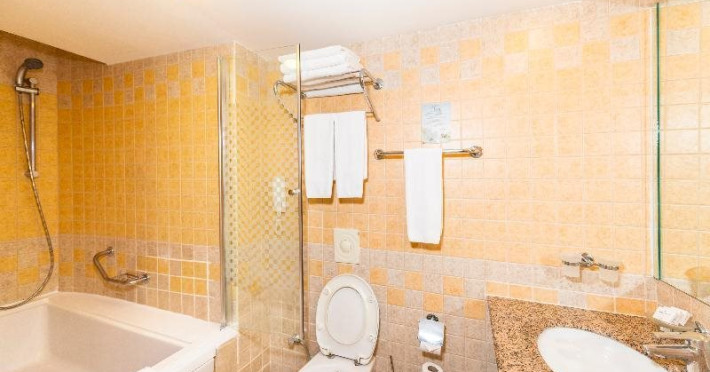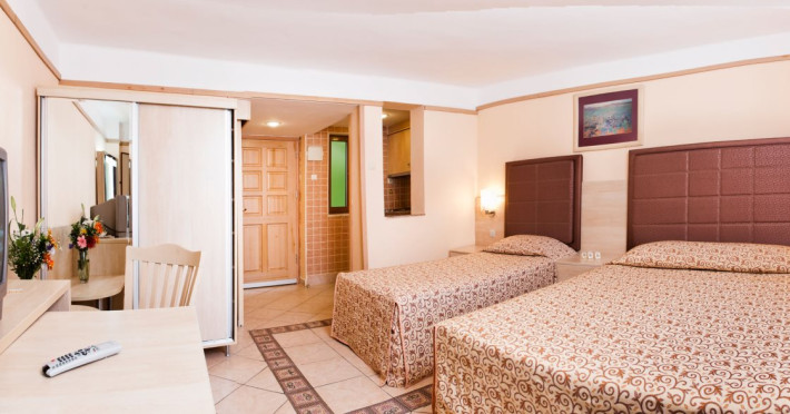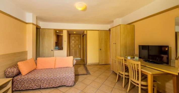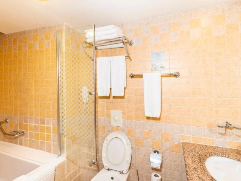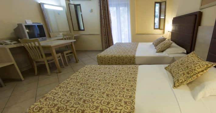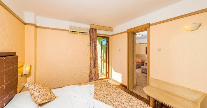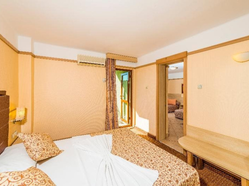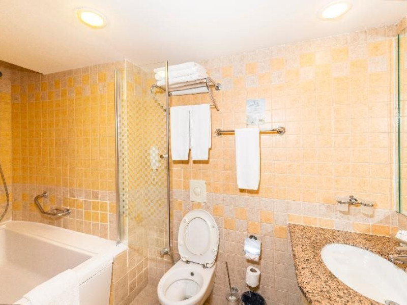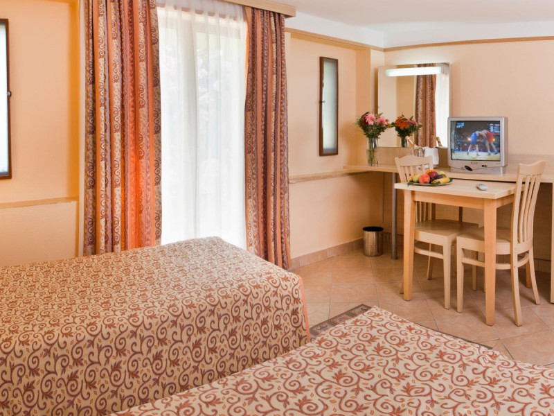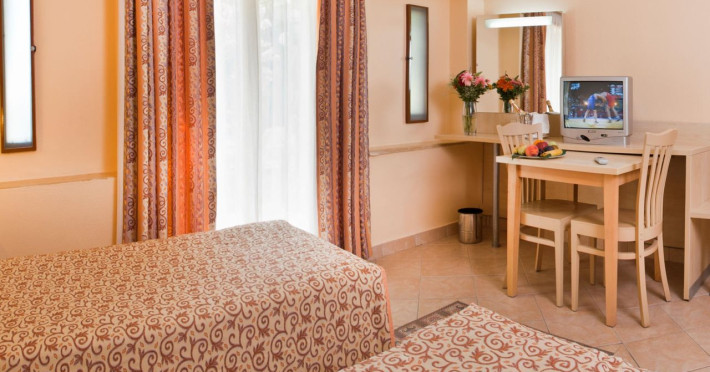 FACILITATI CAMERE: hotelul dispune de 110 camere standard si 2 camere tip family. Camerele duble sunt spatioase dispun de 2 paturi twin / pat dublu, pe jos au pardoseala, patul suplimentar este pat normal, mobilierul este simplu, balconul este mic. Toate camerele dispun de TV cu programe prin satelit, mini bar, aer conditionat, telefon si uscator de par in baie.