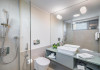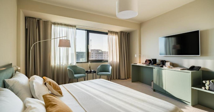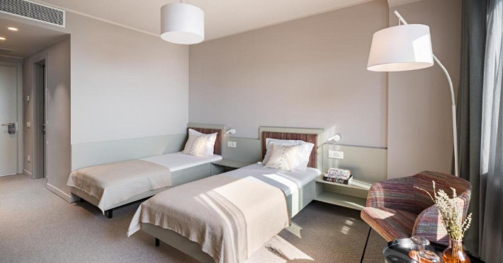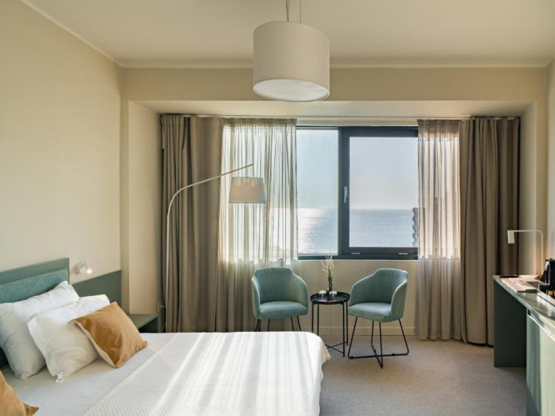 Camera Twin Deluxe are o suprafata de aproximativ 24 mp, ofera vedere la mare si este dotata cu doua paturi de o persoana. Camera dispune de baie proprie cu dus, uscator de par, TV, internet Wi-Fi, aer conditionat, minibar, cafetiera, seif, room service si articole de toaleta premium LaOccitane, fiind ideala atat pentru sejururi leisure, cat si pentru calatorii de business.