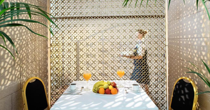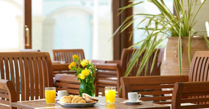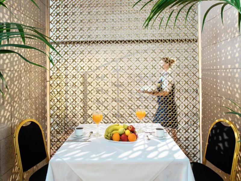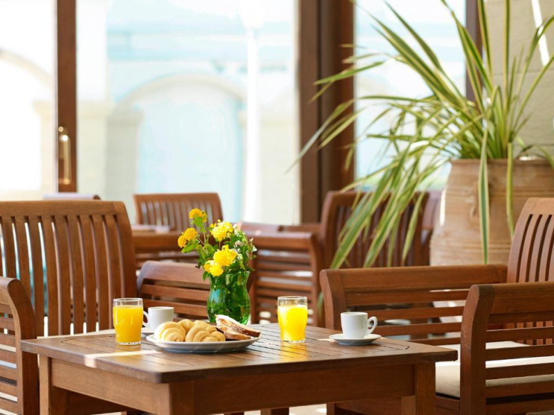 In sala de mese elegantă este disponibil zilnic un mic dejun tip bufet. Barul modern din hol oferă băuturi si cocktailuri pană noaptea tarziu. Oaspetii se pot bucura de cină tip bufet la Mitsis Petit Palais, aflat in apropiere.