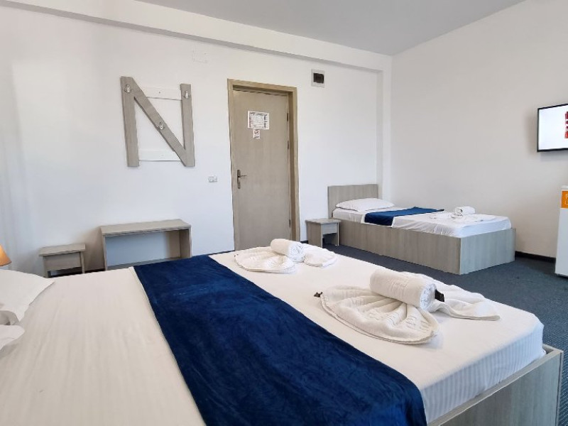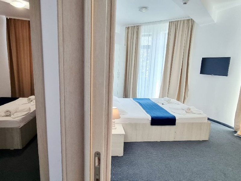 Facilitati Internet Parcare Minibar Aer Conditionat Facilitati copii In camera cu 2 adulti: - 2 copii 0-2.99 ani, copilul beneficiaza de gratuitate la cazare, fara pat suplimentar; - primul copil 3-11.99 ani, copilul beneficiaza de gratuitate la cazare, fara pat suplimentar, al 2-lea achita contravaloarea patului suplimentar; - mai mare de 12 ani, copilul achita contravaloarea patului suplimentar; - 2 copii (0-11.99 ani si > 12 ani), primul copil 0-11.99 ani beneficiaza de gratuitate la cazare, al doilea copil > 12 ani contravaloarea patului suplimentar; - al 3-lea adult are reducere 75% din valoarea unui loc; - 3 adulti si 1 copil 0-11.99 ani (in tripla/ apartament), copilul beneficiaza de gratuitate la cazare; - 3 adulti si 1 copil peste 12 ani (in apartament), copilul achita 60 lei/ zi; - a 4-lea adult in apartament achita 60 lei/ zi. PAT SUPLIMENTAR - 60 lei/zi Capacitate maxima in camerele duble: 2 adulti si 2 copii (0-11.99) sau 2 adulti + 1 copil 0-11.99 + 1 copil peste 12 ani. Capacitate maxima in camerele triple: 3 adulti + 1 copil 0-11.99 ani. Capacitate maxima in: 4 adulti. MIC DEJUN - 0-4.99 ani beneficiaza de mic dejun gratuit; - 5-11.99 ani achita 50% din micul dejun; - peste 12 ani achita micul dejun integral.