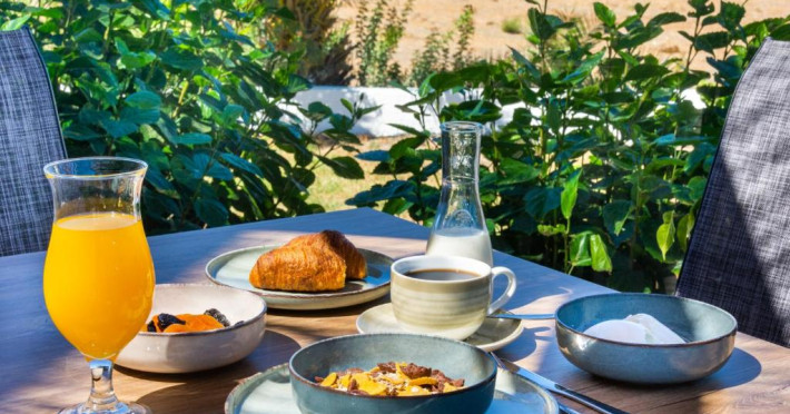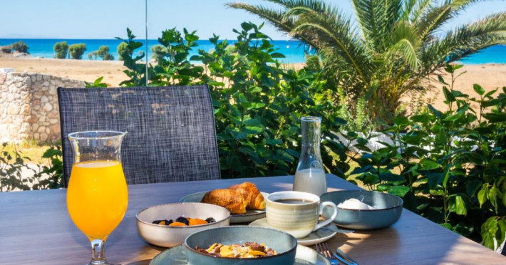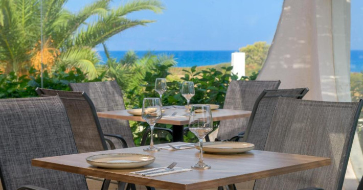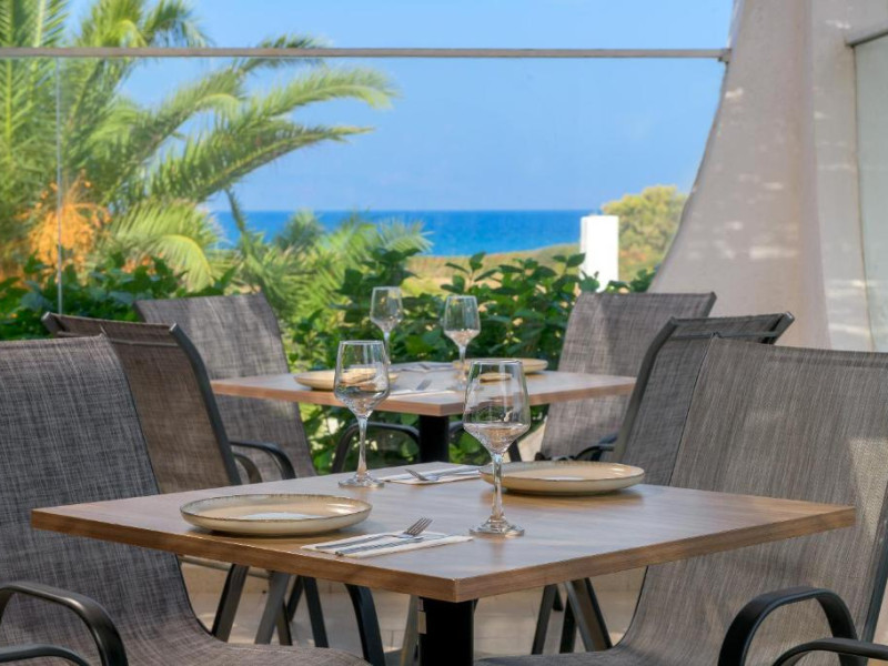 Zilnic se servește un mic dejun tip bufet, iar snack barul oferă gustări, sucuri și băuturi alcoolice de la ora 09:00 pană la miezul nopții. Restaurantul à la carte oferă arome grecești.