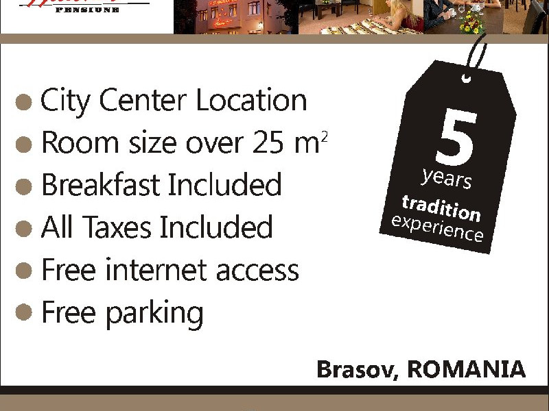 INFORMATII GENERALE Situata in inima Brasovului, Pensiunea Ambient inseamna stil, confort, rafinament si eleganta pentru orice anotimp! Excelenta in rafinamentul amenajarilor interioare, dar si al dotarilor, atmosfera calda si serviciile de cea mai inalta calitate fac din Pensiunea Ambient destinatia ideala pentru o calatorie de afaceri sau un refugiu ospitalier daca va aflati in tranzit si aveti nevoie de o scurta pauza de revigorare. Veti descoperi profesionalismul unor servcii de inalta calitate ce imbina intr-un mod placut caldura si ospitalitatea de altadata cu tehnologia moderna, Pensiunea Ambient oferind atmosfera perfecta pentru calatorul decis sa ii treaca pragul. Receptia, salonul de mic dejun, barul si spatiile de cazare ofera toate ingredientele unui sejur confortabil, intr-o ambianta moderna. Pensiunea Ambient va asteapta intodeauna cu ospitalitatea sa caracteristica si serviciile ireprosabile orientate catre satisfacera tutror cerintelor dumneavoastra. Design-ul clasic incanta privirea, oferind acea stare de liniste interioara pe care o doreste fiecare calator. Prin excelenta un mediu creat cu atentie pentru oaspeti, adaptat nevoilor si asteptarilor cele mai exigente. De curand s-au inaugurat cele 2 sali de conferinte cu capacitati de 40 respectiv 28 locuri precum si un spatiu special destinat pauzelor de cafea.