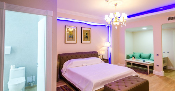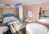 Sunset Apartment - cuprinde un spatiu generos de 61 mp, format dintr-un living si un dormitor cu pat matrimonial, o cada rotunda in fata patului, baie cu dus, balcon, vedere frontala catre lacul Siutghiol. Capacitate maxima: 2 adulti