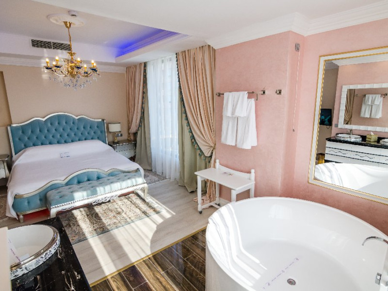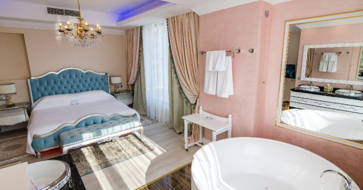 Deluxe Suite - cuprinde un spatiu deschis cu o suprafata de 60 mp, zona pentru dormit cu un pat matrimonial, o camera separata pentru copil, , baie cu dus, balcon, vedere laterala catre mare. Capacitate maxima: 2 adulti si 2 copii ( 0 - 11.99 ani ) Junior Suite - - cuprinde un spatiu deschis cu o suprafata de 42 mp, zona pentru dormit cu pat matrimonial, canapea pentru dormit ( dimensiuni 90cm/170cm) , baie cu dus, balcon inchis cu grilaj. Capacitate maxima: 2 adulti si 2 copii ( 0 - 11.99 ani ) Sunrise Apartment / Sea of Love Apartment - cuprinde un spatiu generos de 61 mp, zona pentru dormit cu un pat matrimonial, o cada rotunda in fata patului, zona de relaxare cu canapea fixa, baie cu dus, balcon, vedere frontala catre Marea Neagra. Capacitate maxima: 2 adulti