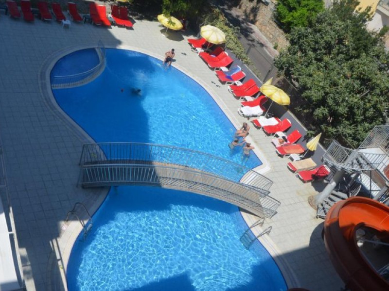 Copiii se pot distra la piscina special amenajată, prevăzută cu tobogane cu apă.