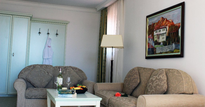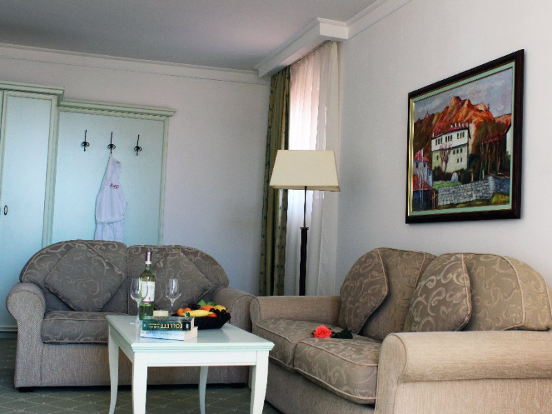 FACILITATI CAMERE: Camerele sunt dotate cu TV, telefon, uscator de par, minibar, aer conditionat, tersa sau balcon. Camerele superioare sunt mai spatioase si pot caza 3 adulti sau 2 adulti + 1 copil (al treilea pat este o canapea extensibila). Suitele : living si dormitor ( cu pat dublu sau twin ), canapea extensibila in living, Tv prin staelit, aer conditionat / incalzire, telefon, uscator de par, seif, balcon, maxim de cazare: 2 adulti + 2 copii sau 3 adulti si au cca 65 mp.
