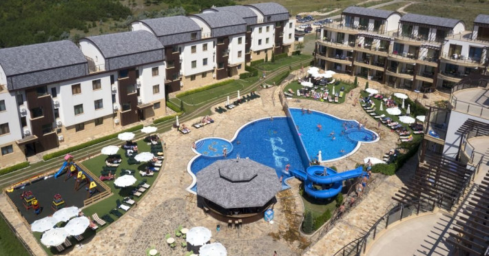 Localizare: in prima linie de hoteluri, la 150 m de plaja . A fost construit in anul 2009 si se afla intre Blachik si Kavarna Capacitate complex: mai multe corpuri a cate 4 etaje, 44 apartamente 1 dormitor, 5 apartamente 2 dormitoare. Facilitati: piscina exterioara pentru adulti, piscina exterioara pentru copii, centru wellness, fitness, sauna, baie de aburi, jacuzzi, masaj, tobogane, 2 restaurante (principal si panoramic), 2 baruri, seif la receptie, lift (doar in cladirea cu receptia), internet cafe, internet wireless, exchange, rent-a-car, spatiu de joaca pentru copii, camera de joaca pentru copii (gratuita), tenis de masa, volei, basket, teren de tenis, fotbal, golf, biliard, jocuri mecanice, sala de conferinte (60 - 80 persoane) cu echipament, centru de afaceri, shuttle bus pana la / de la plaja (intre 09:00 - 17:00, din 30 in 30 min zilnic), zona securizata, zona de parc si gradini. Umbrelele si sezolungire la plaja se platesc. Pe plaja publica se gasesc restaurante si baruri.