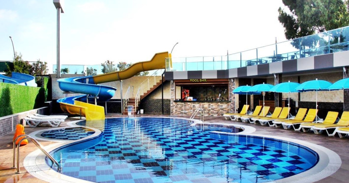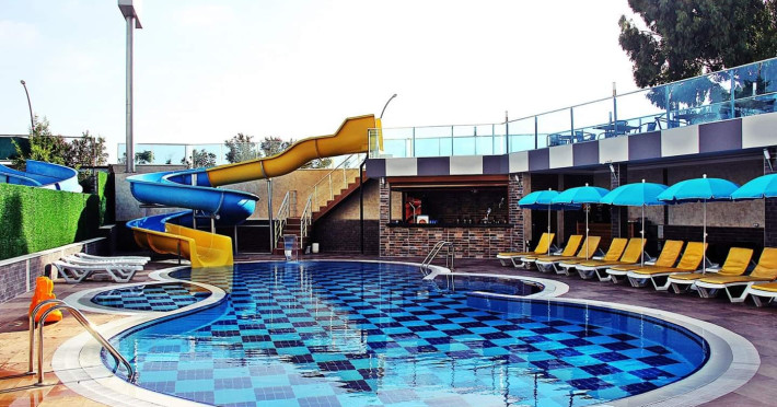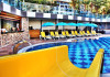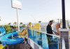 Copiii se pot distra la piscina special amenajată, prevăzută cu tobogane cu apă.