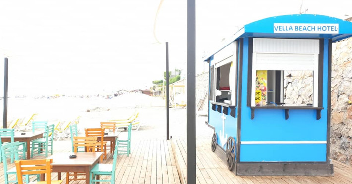 Vella Beach Hotel are în apropiere o plajă cu nisip. Pe plajă există șezlonguri și umbrele de plajă.