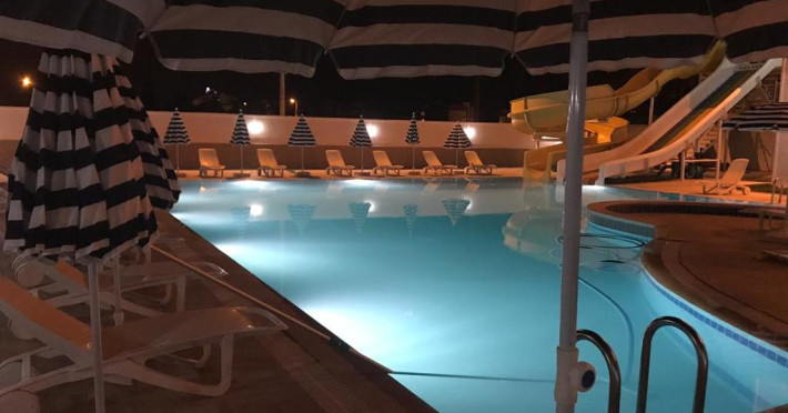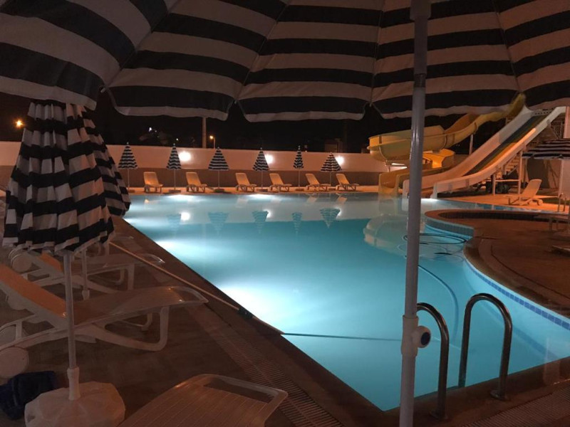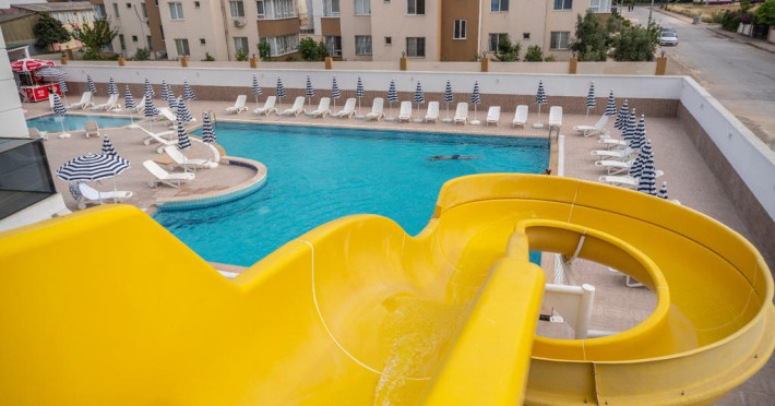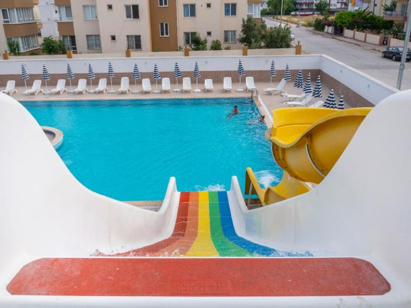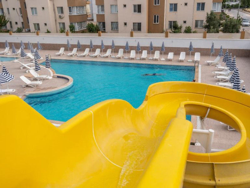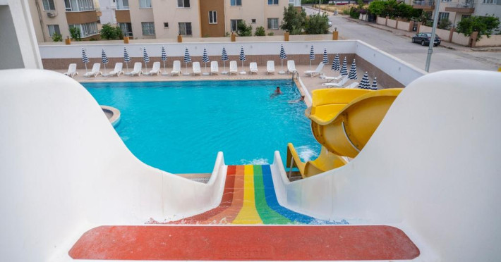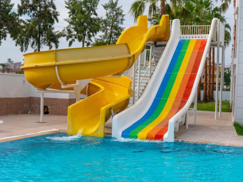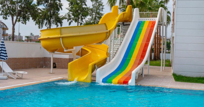 Copiii se pot distra la piscina special amenajată, prevăzută cu tobogane cu apă.