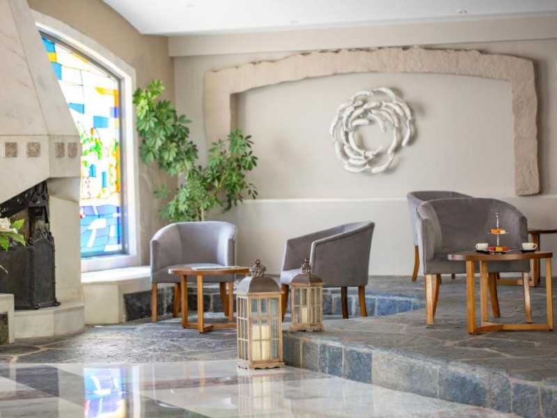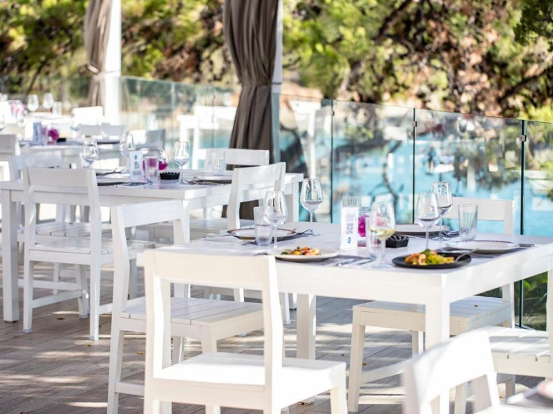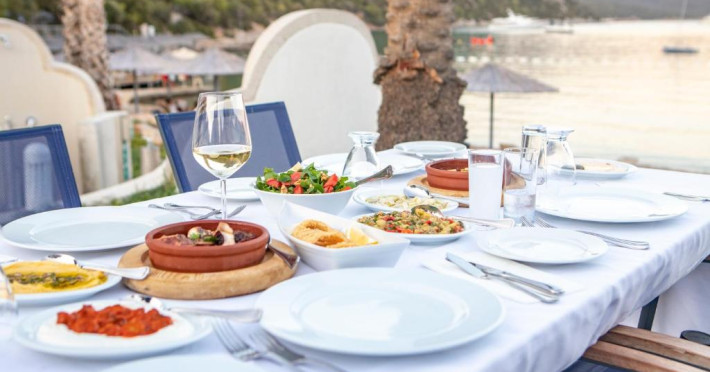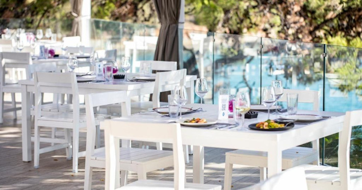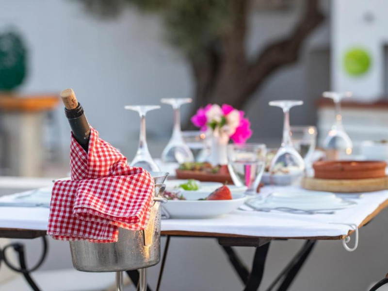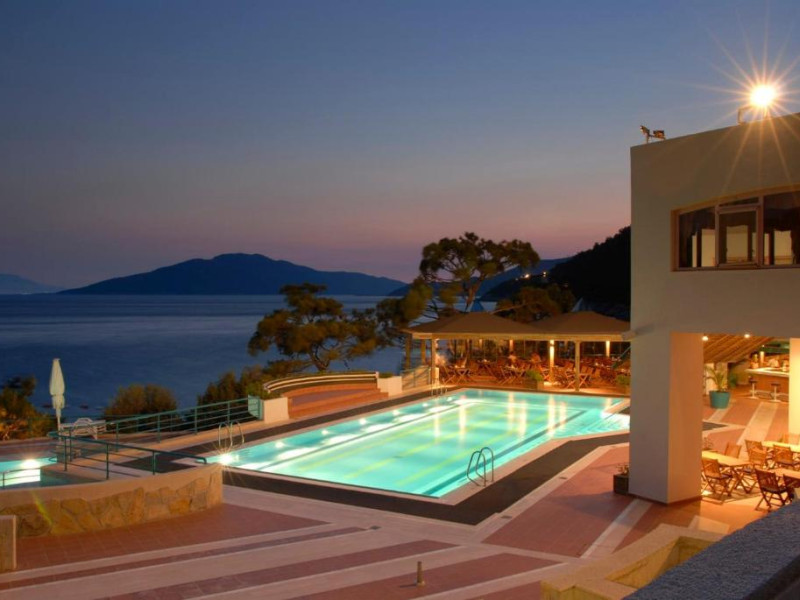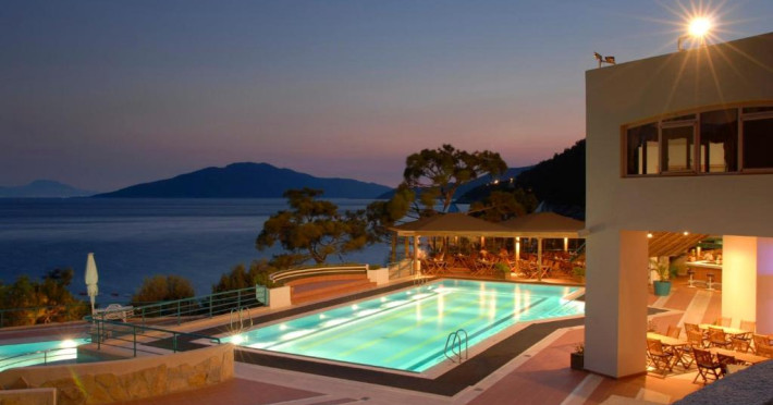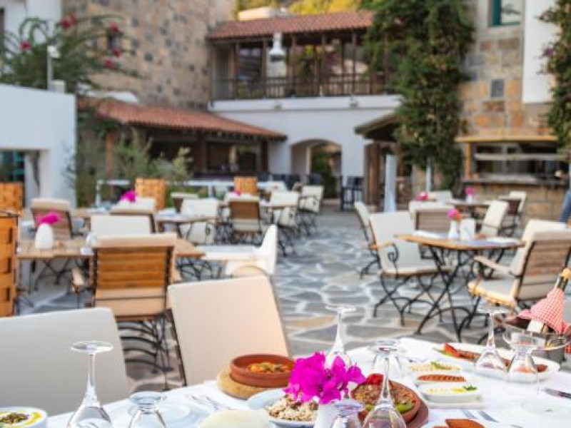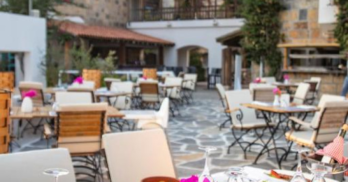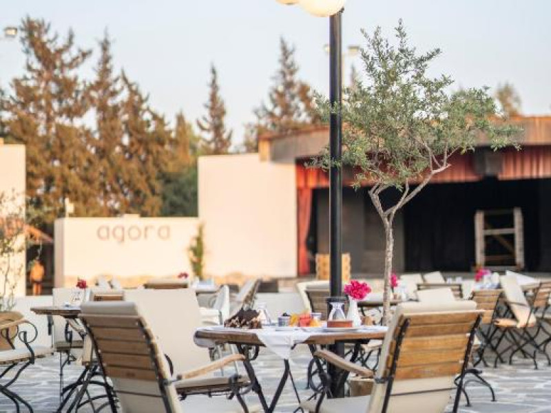 Oaspetii pot lua masa la restaurantul romantic al hotelului, cu vedere la Marea Egee si la munti. Barul oferă o varietate de băuturi, iar complexul are si un club de noapte.
