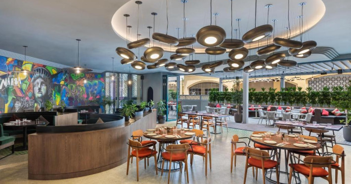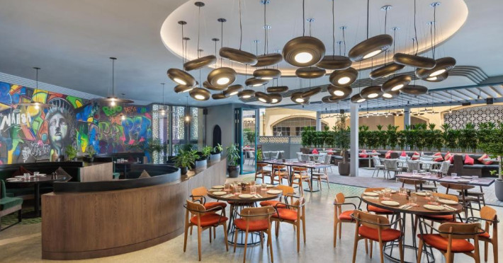 Oaspeții pot savura un mic dejun tip bufet, continental sau italian. JA Ocean View Hotel, Jumeirah Beach Dubai are un restaurant care servește mancăruri din bucătăria americană, argentiniană și braziliană. La cerere, sunt disponibile și preparate vegetariene, fără lactate și halal.