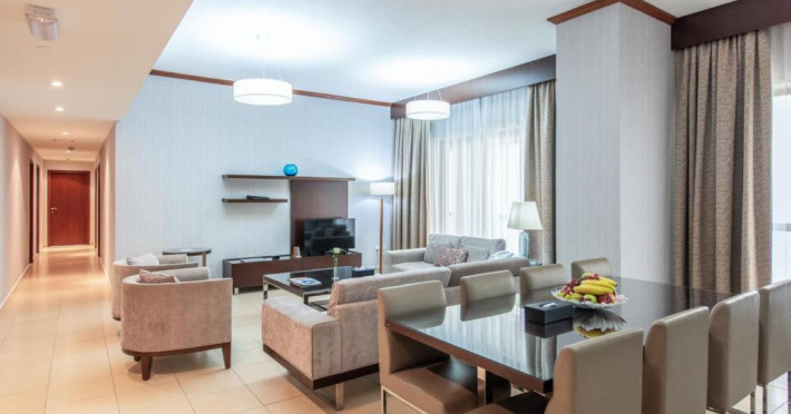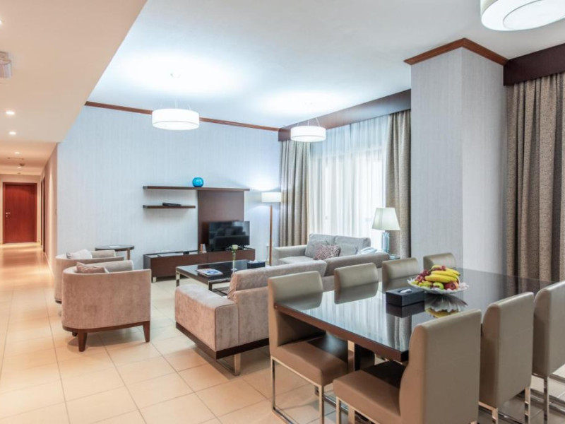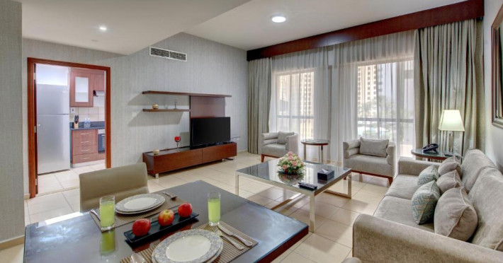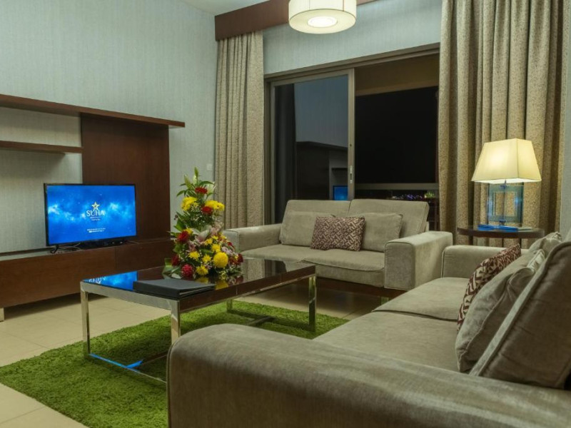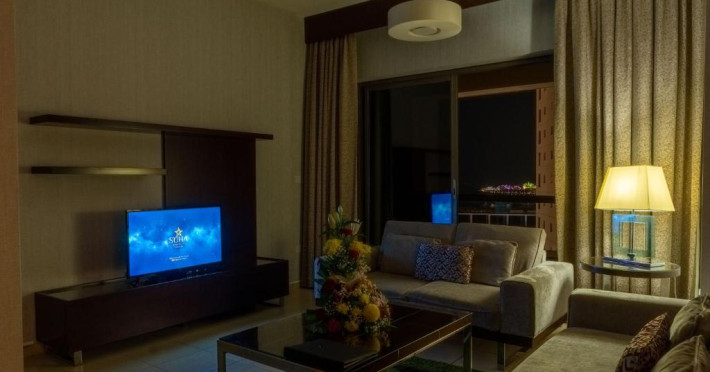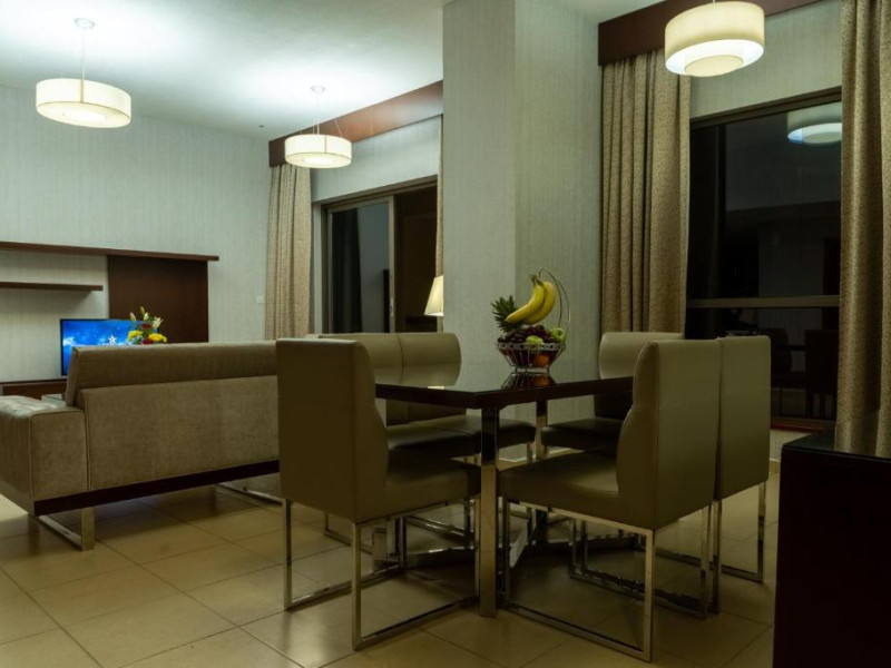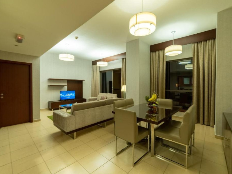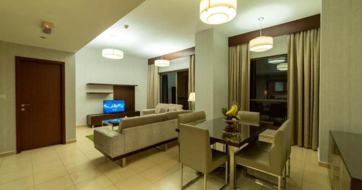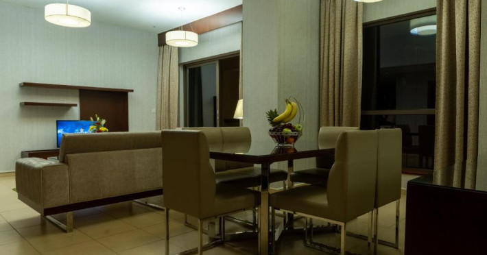 Apartamentele de la SUHA JBR Hotel Apartments au aer aer, TV cu plasmă, cutie de valori digitale și zonă de luat masa.