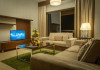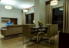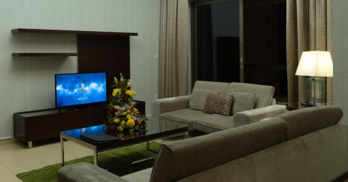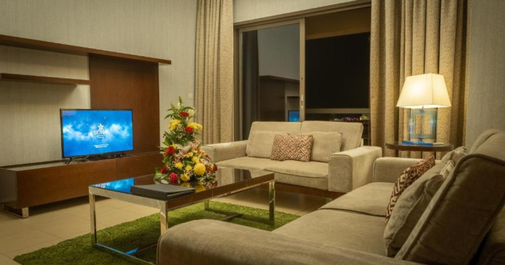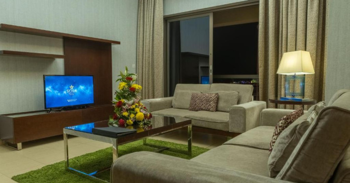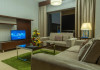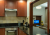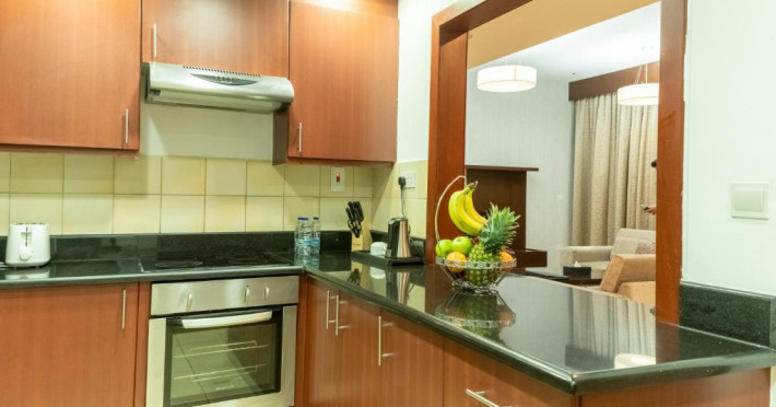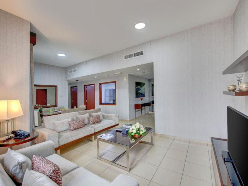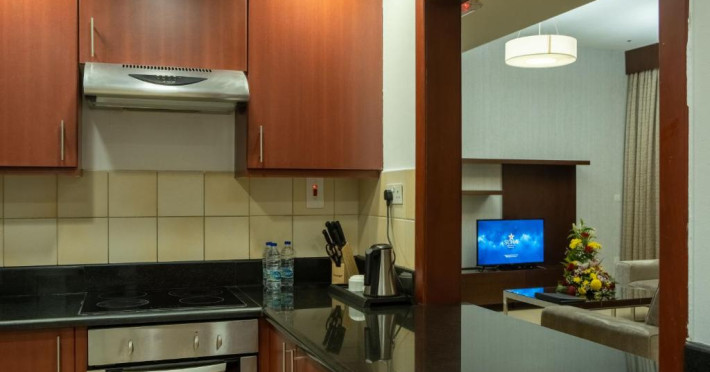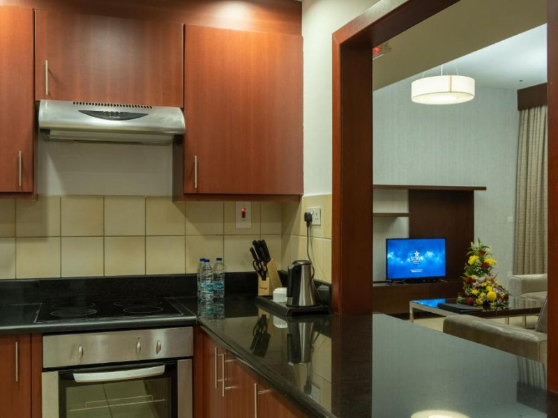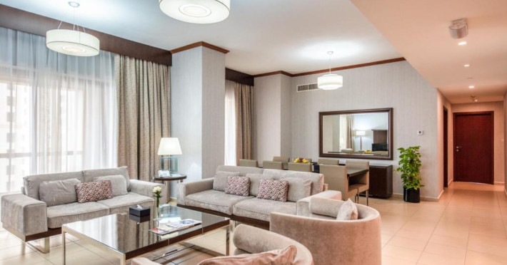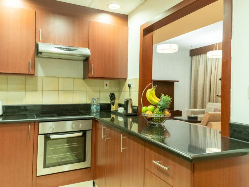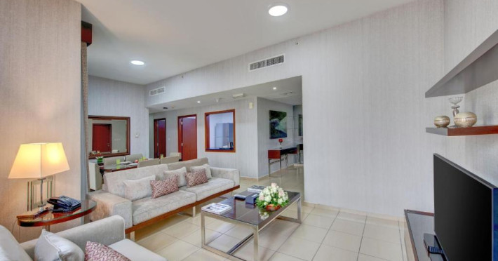 Apartamentele de la SUHA JBR Hotel Apartments au aer aer, TV cu plasmă, cutie de valori digitale și zonă de luat masa.